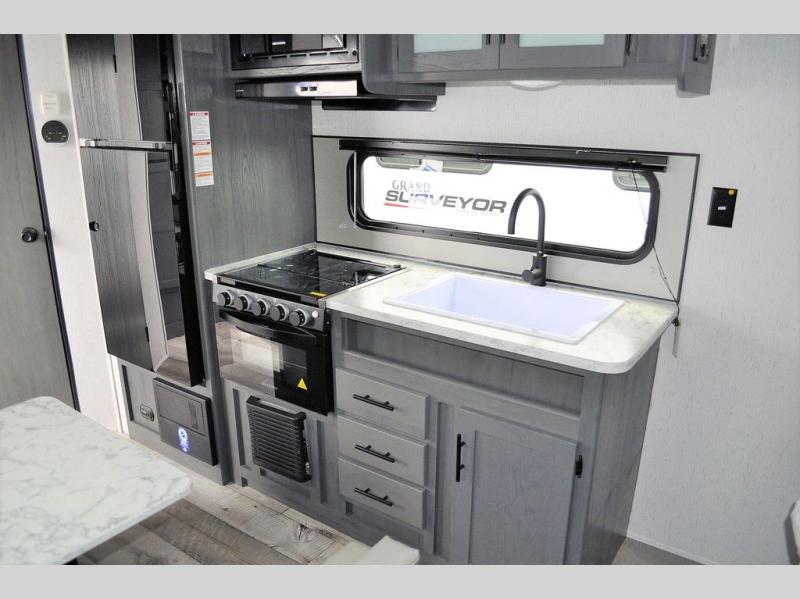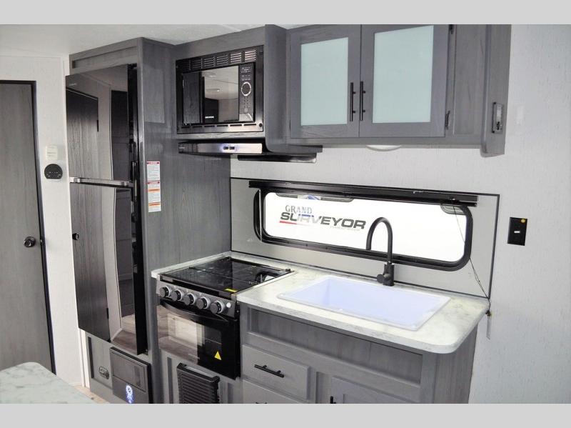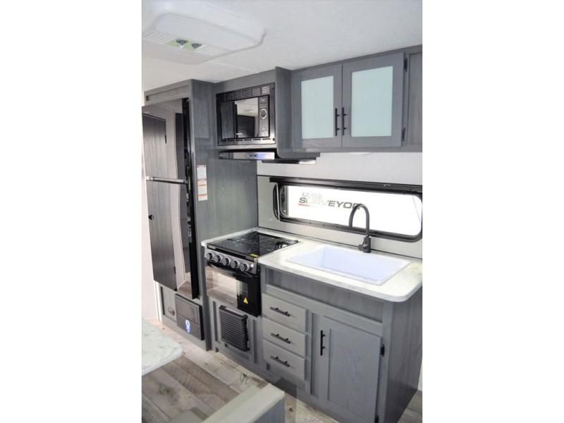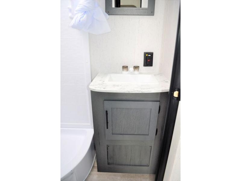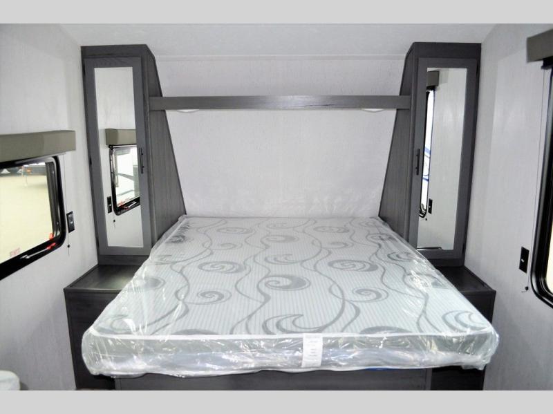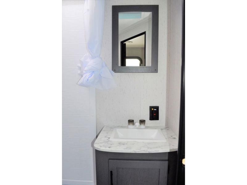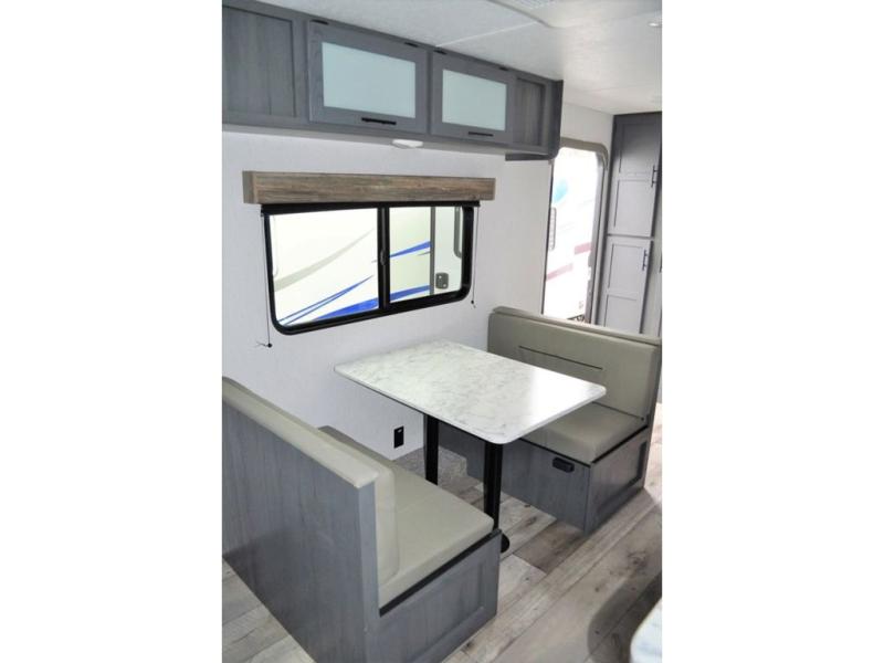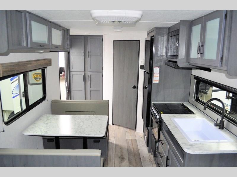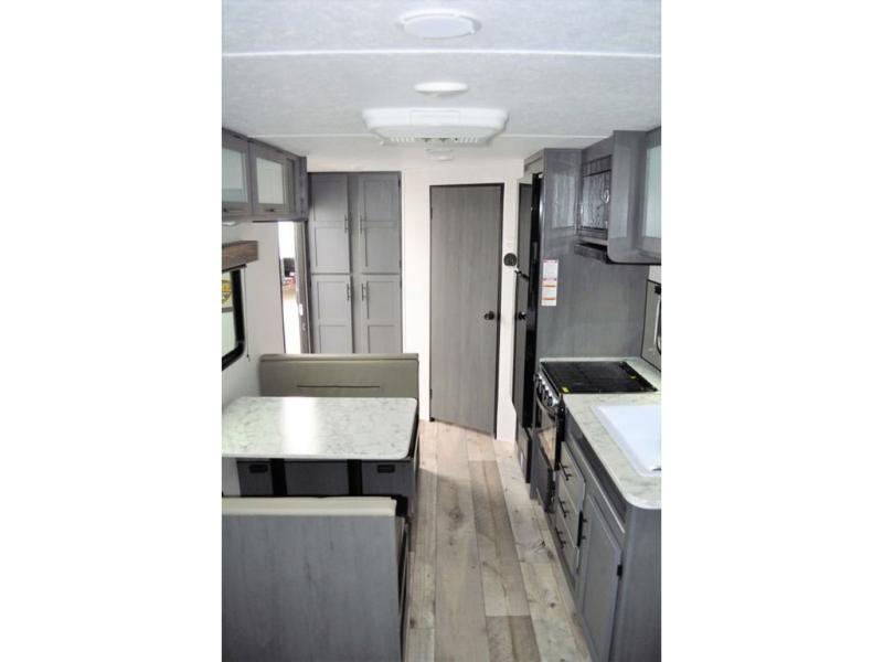 This Aspen Trail travel trailer is the perfect couple's getaway! With a queen-size bed up front that has wardrobes on either side and overhead cabinets above, as well as a rear corner bathroom, you can start each day clean and relaxed. Just outside the bathroom is a closet for you to use how you please, and across from it is the booth dinette where you can enjoy your meals, play a card game, or even transform into an extra sleeping space if needed!