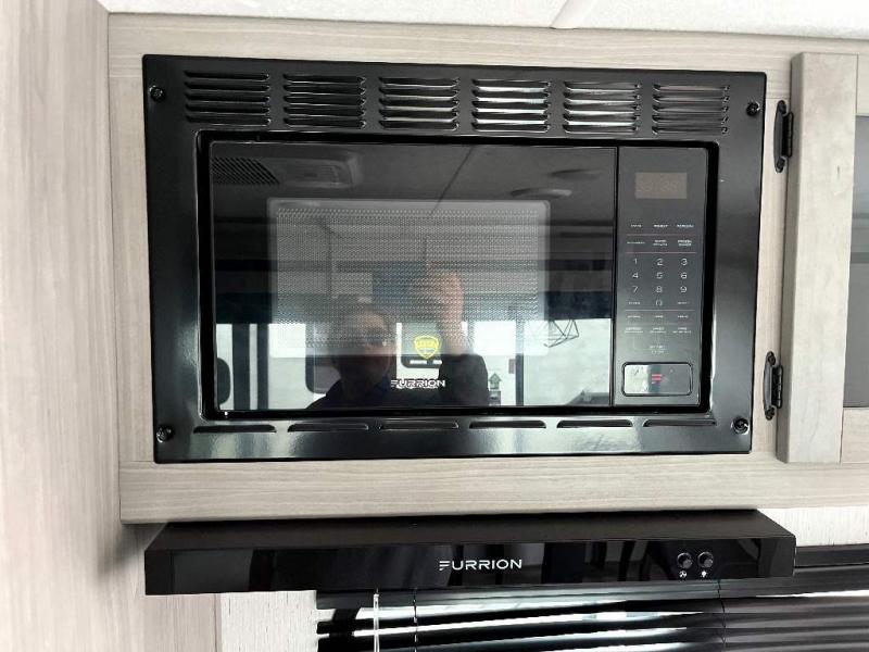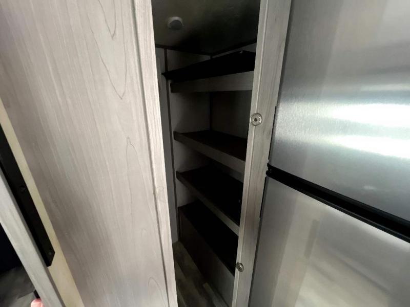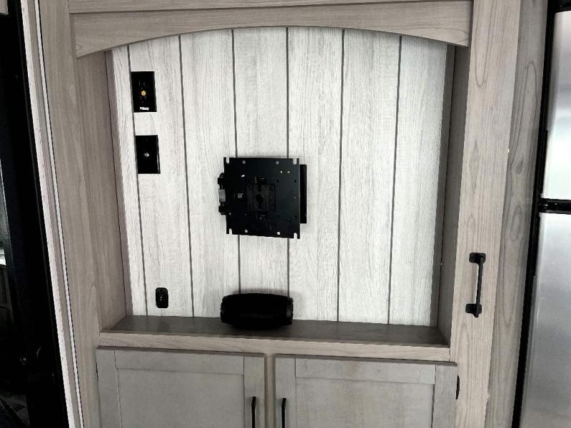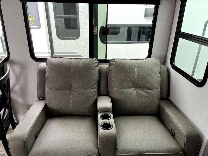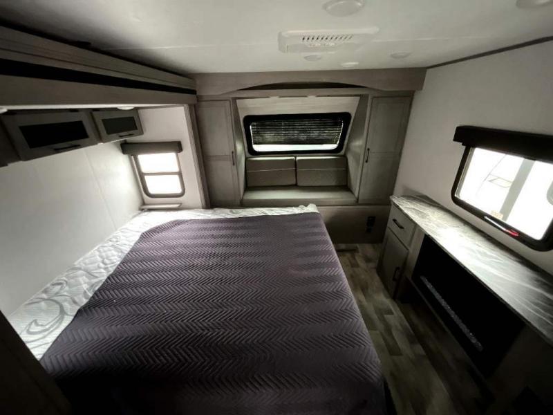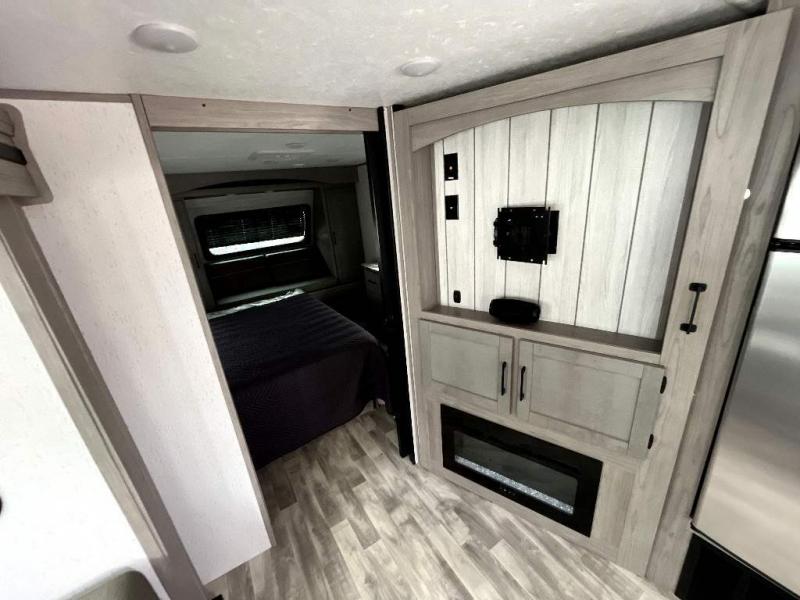 Head to your favorite state park in this cozy travel trailer. You will love the spacious full rear bath that includes plenty of storage space for necessities and clean towels. The U-shaped dinette can be used to dine on or sleep on, so invite a couple friends along. Head to the kitchen to prepare lunch on the three burner cooktop with an oven, or you can use the outside kitchen to grill the catch-of-the-day on! This model also includes a front private bedroom with a slide out king bed, a fireplace, plus a front bench seat where you can easily put your hiking boots on!