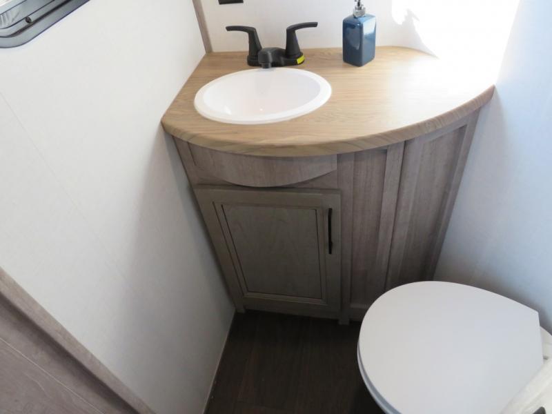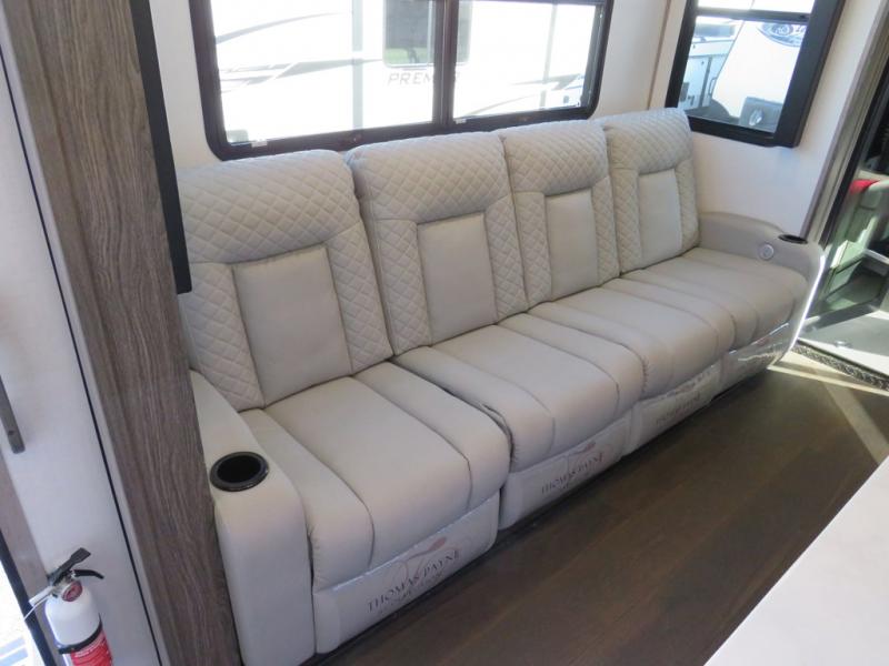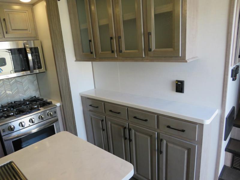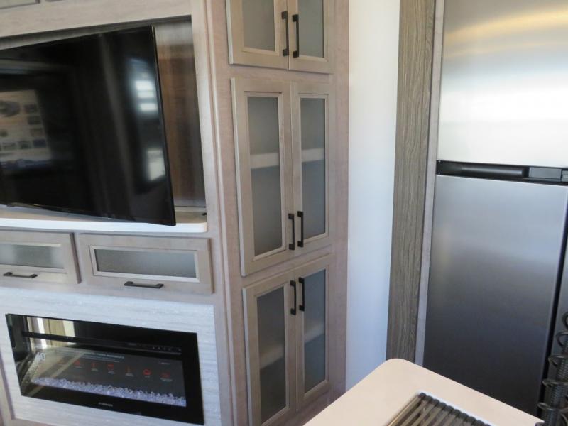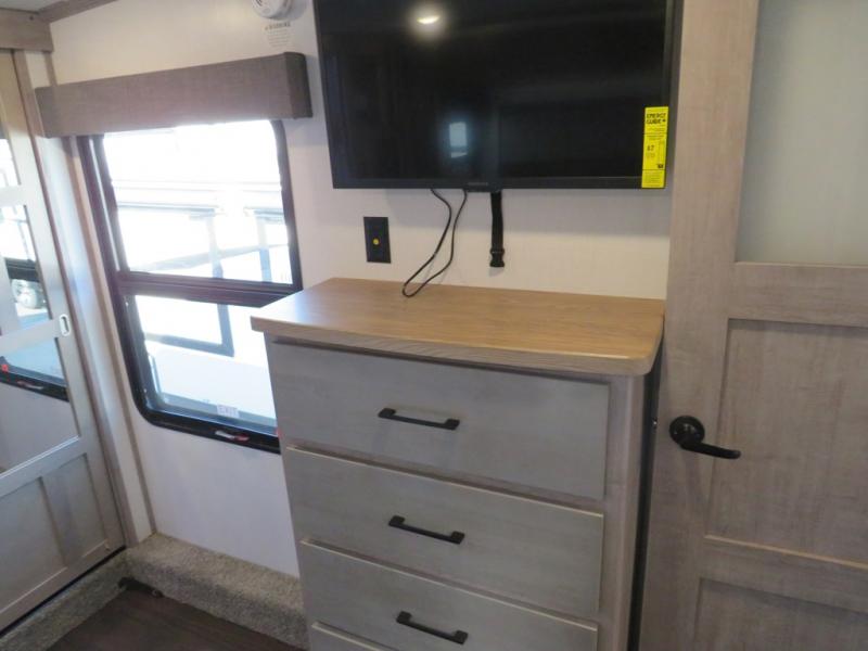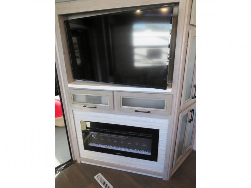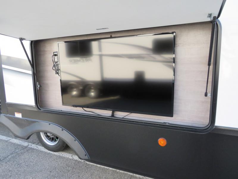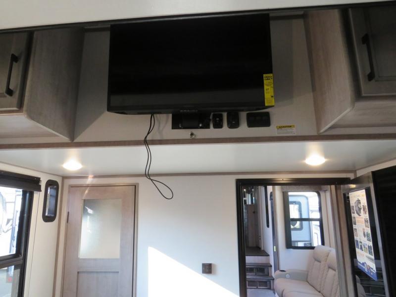 The whole family will have a fun time camping in this toy hauler! The front private bedroom will have you feeling right at home with the king bed slide and front wardrobe, plus access to the dual entry bathroom which has a shower with a luxury teak seat. Keep everyone's bellies full with the kitchen island and Furrion three burner range with 21" oven, and enjoy the meals at the opposing sofas with table in between in the 11' garage. Relax each night in true comfort on the sofa slide across from the entertainment center or head to the outside entertainment center. The garage area also has a loft for extra sleeping, a half bathroom, a lay flat Happi-Jack power bunk, and one of the dual entry doors to the unit!