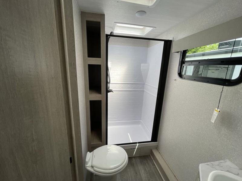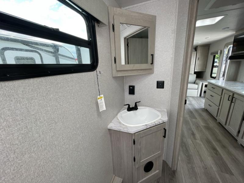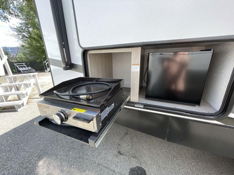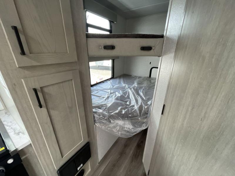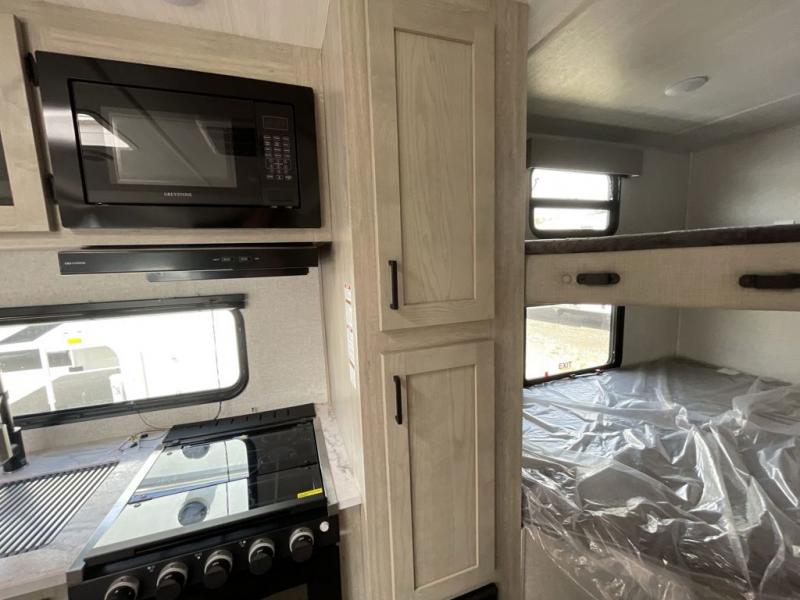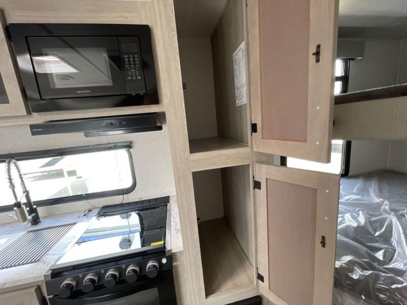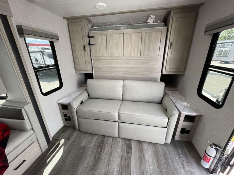 Double over double bunks are sure to be fun for everyone! With a queen Murphy bed that can be hidden away during the day, this travel trailer is versatile. A center kitchen with three-burner cooktop, refrigerator, and pantry will make cooking easy, and the booth dinette is a great choice, or you can exchange it for the optional free-standing dinette. A rear bath has a linen closet for towel storage, and the shower skylight lets the light in. Outside you'll find a whole other set of features, like a outside kitchen, TV hookup, and a storage door that is large enough for bikes or kayaks. Perfect for the outdoor adventure you've been craving!