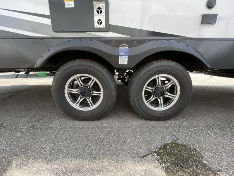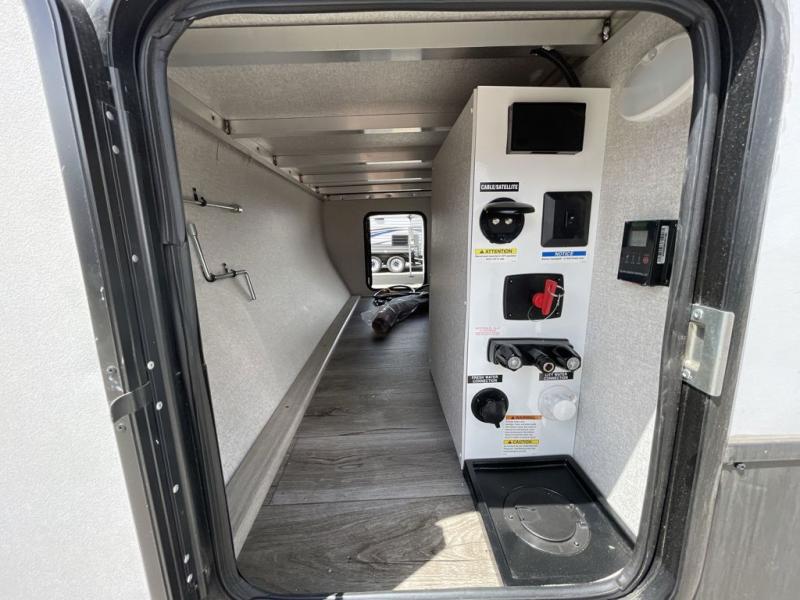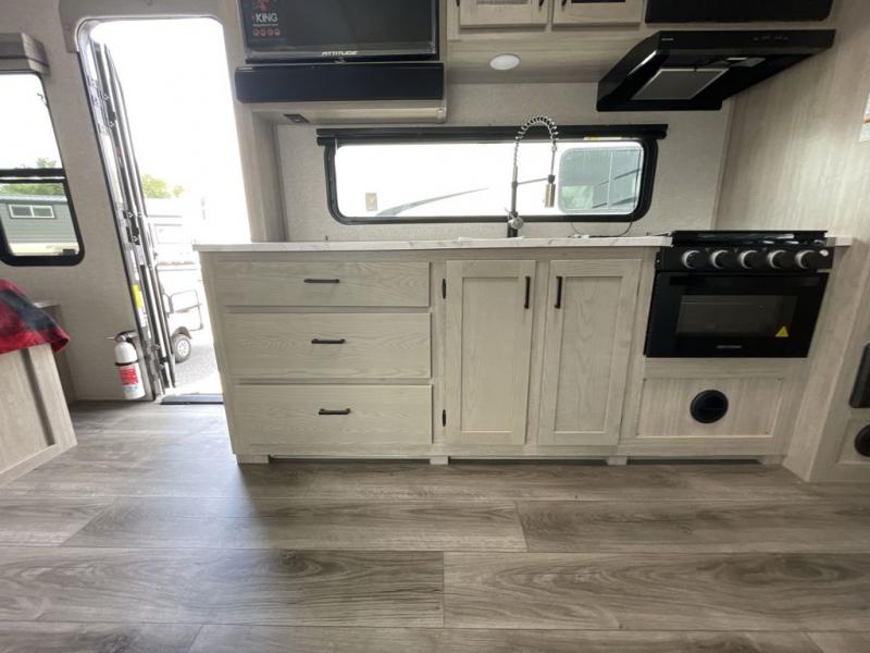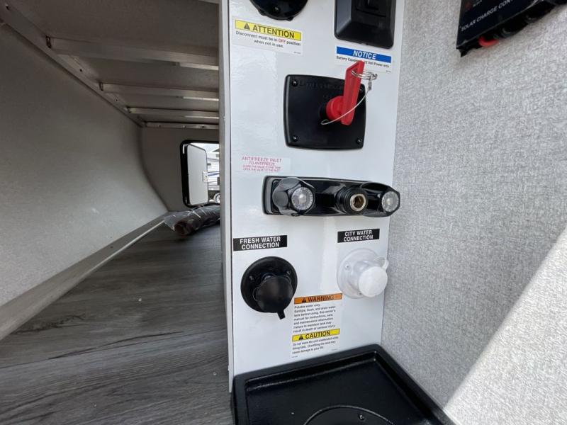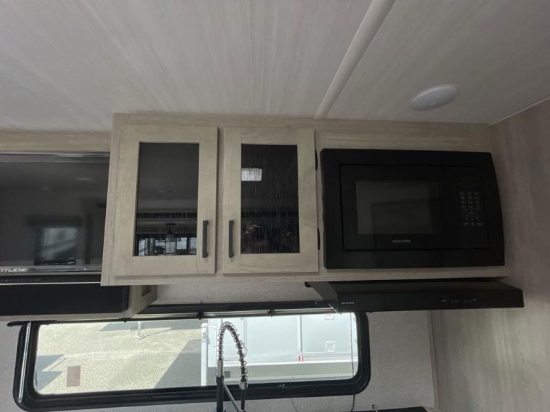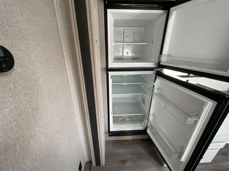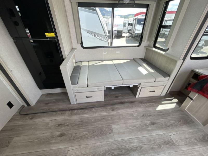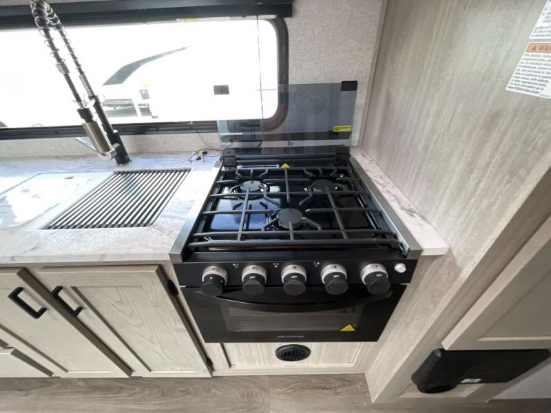 Double over double bunks are sure to be fun for everyone! With a queen Murphy bed that can be hidden away during the day, this travel trailer is versatile. A center kitchen with three-burner cooktop, refrigerator, and pantry will make cooking easy, and the booth dinette is a great choice, or you can exchange it for the optional free-standing dinette. A rear bath has a linen closet for towel storage, and the shower skylight lets the light in. Outside you'll find a whole other set of features, like a outside kitchen, TV hookup, and a storage door that is large enough for bikes or kayaks. Perfect for the outdoor adventure you've been craving!