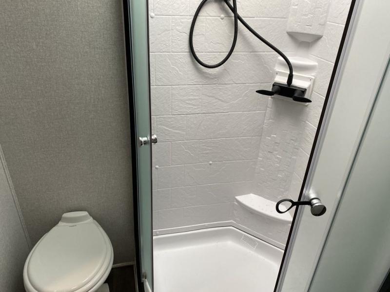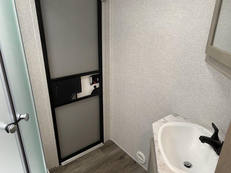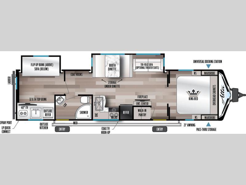 If you're looking for a travel trailer to take tailgating, this Alta model is the one! After you've unloaded the pass-through storage and set up the 21' power awning, start lunch on the outside kitchen! Since there are dual entry doors you can enter in through the main living area, or the full bath for convenience. The little ones are sure to spend most of their time in the rear bunkhouse that includes a flip-up bunk under the sofa, plus a second bunk across the room. The adults can visit at the booth dinette or on the tri-fold sofa, and check out the front private bedroom with sliding doors and a king bed for all-around comfort!
