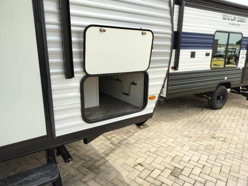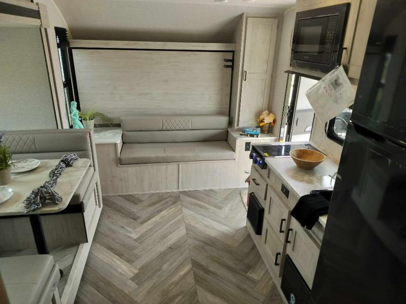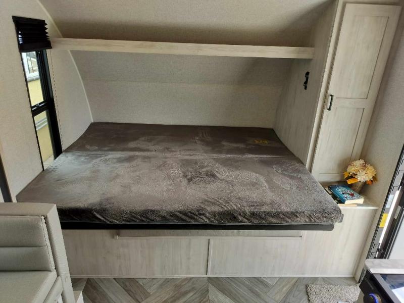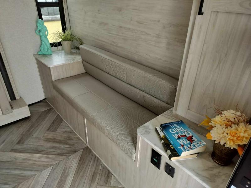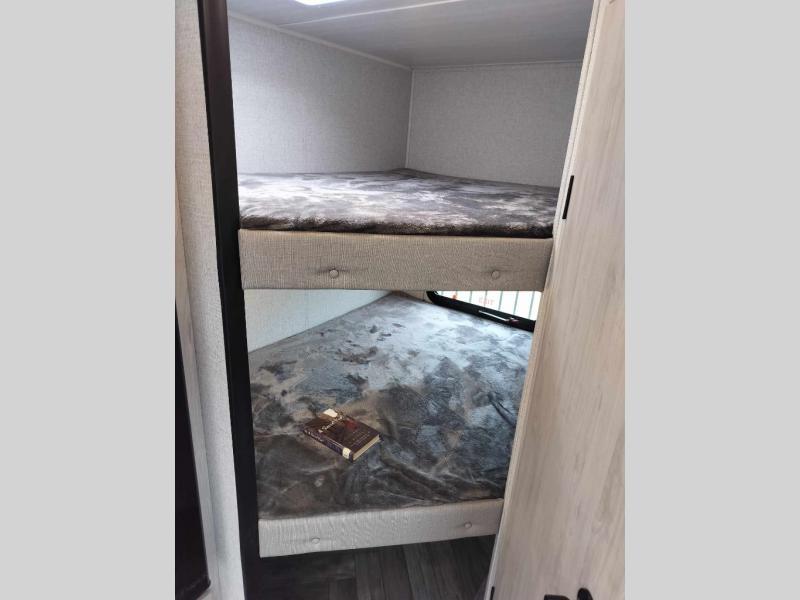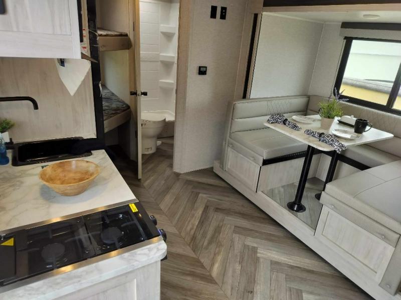 This Della Terra LE is perfect for your family of six or eight. With 50" x 68" bunks in the back, and a queen Murphy bed in front, as well as a large u-shaped dinette, you can easily sleep eight total! There is a fold up sofa when the Murphy bed is in the stored position for more daytime seating. At night, the sofa back cushion folds down to allow the Murphy bed to be set up. You don't even have to make your bed if you don't want to! The dinette is a great place to relax and enjoy a meal, or to socialize and play a game when inside. The u-shaped dinette slides out to provide more interior walking around space for everyone. There is a rear corner bath featuring a 24" x 40" shower with skylight overhead for more natural lighting and headroom, plus a toilet and vanity with sink and shelving for your towels and things. On the outside, enjoy a nice pass-through storage area. It's time to grab some gear and a few friends and get camping!