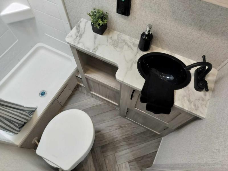 With any Della Terra travel trailers by EAST TO WEST, there is aluminum siding, bowed truss roof rafters, a one-piece seamless DiFlex ll roof, fiberglass insulation throughout, and a fully enclosed and heated underbelly with anti-puncture underbelly allowing you to stay and travel during any climate. The LE Edition value package will provide your family with USA manufactured furniture, seamless countertops (no T-mold), a solid entrance step at the main door, an outside hot and cold shower, plus an 11 cu. ft. dual hinge black glass frost free 12 volt refrigerator for your perishables. A Solera power awning with adjustable legs and LED light strip will also provide you with a great outdoor living area protected from both the sun and rain.