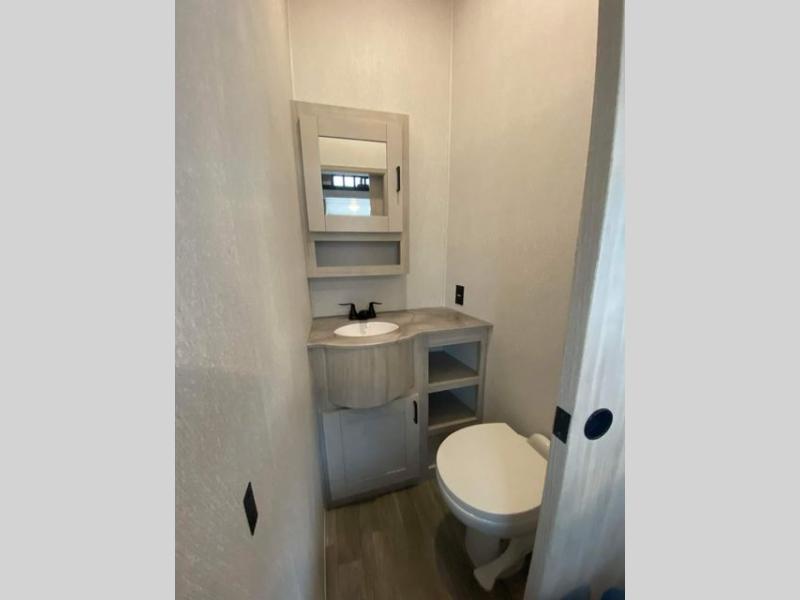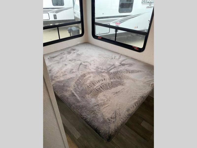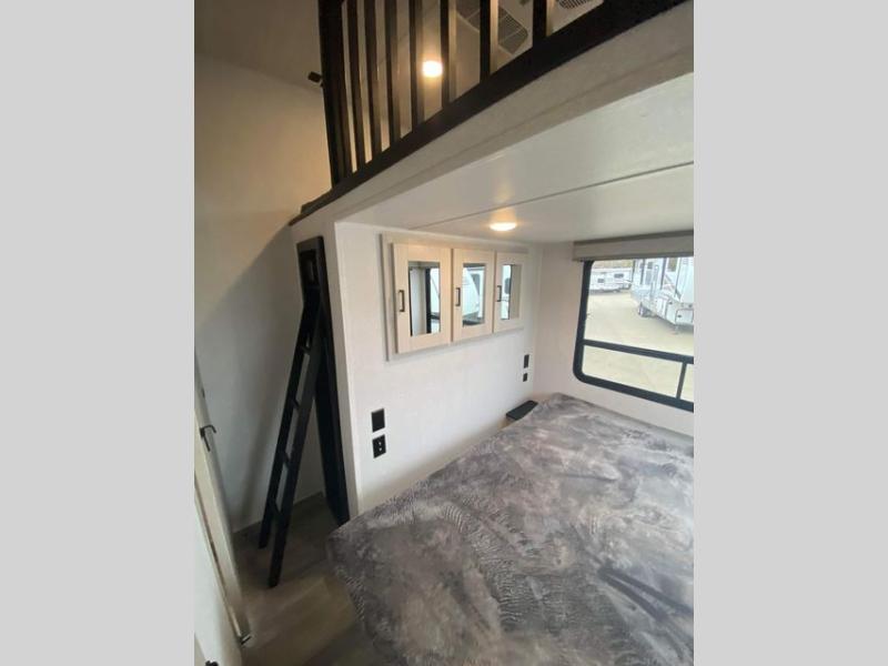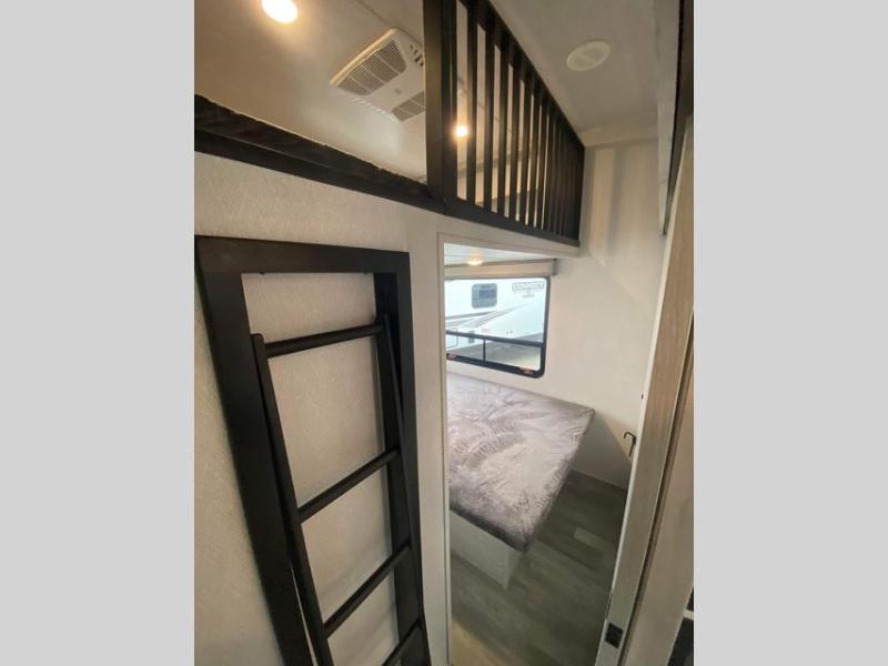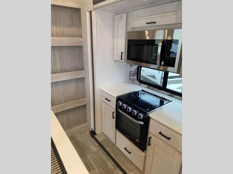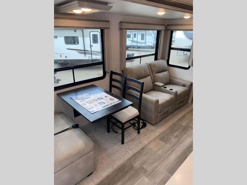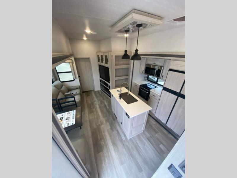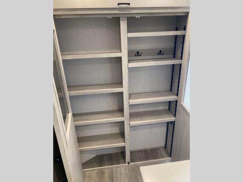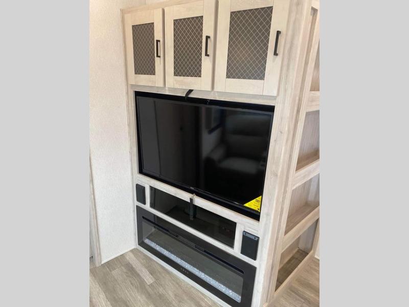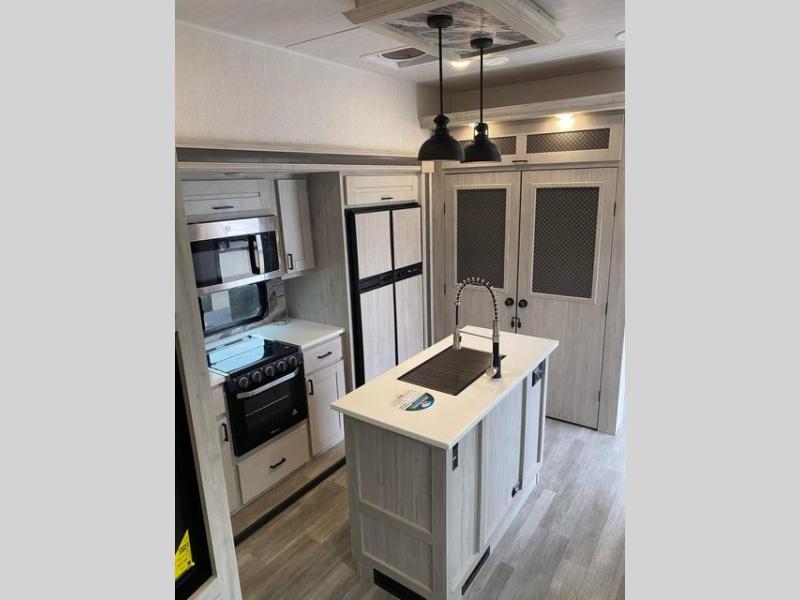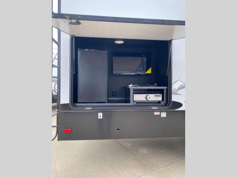The rear guest suite and the front master suite on this Tandara fifth wheel will have you living in the lap of luxury while you camp! The front bedroom connects with a private entrance to the dual-entry bathroom, and the half bathroom is located back in the guest suite. Also located back in the guest suite is a loft bed with a ladder and loft storage. The main living area has a theater seating and a free-standing dinette to sit down and chat with the chef who is preparing dinner on the four-burner range. The double-door pantry and coat closet will keep your snacks and jackets stored away so that they don't clutter the interior, and you can also head outside to find more meal prep space at the outdoor kitchen.