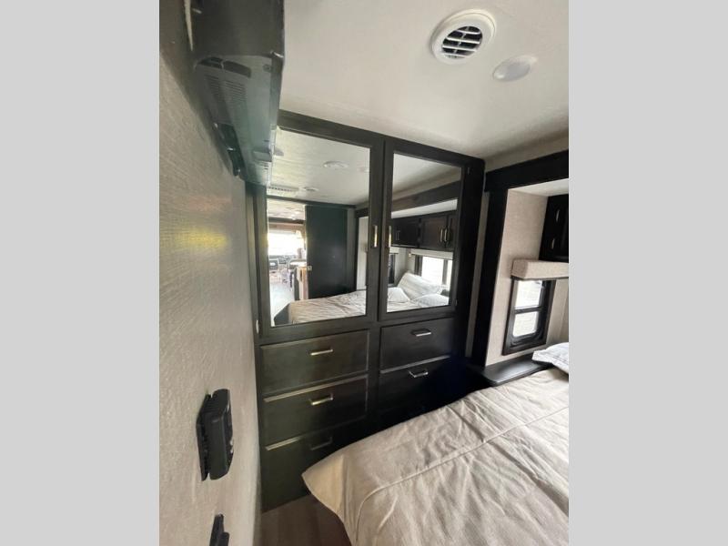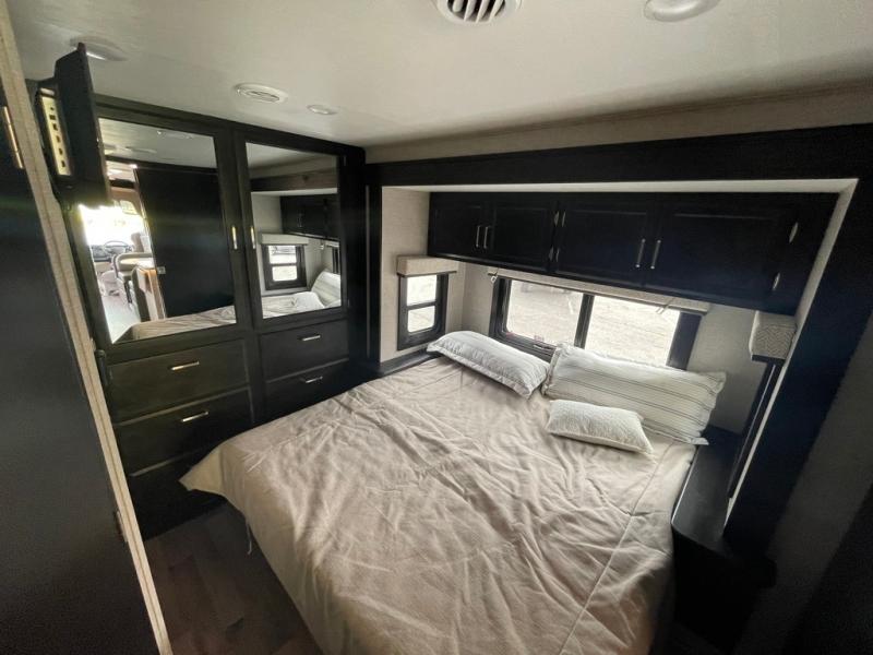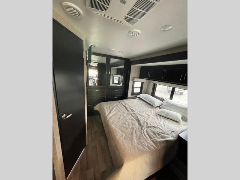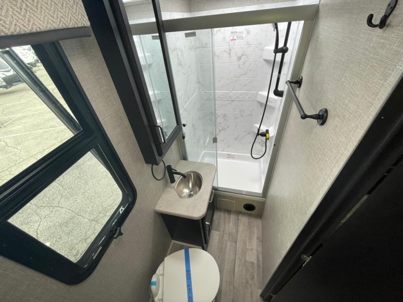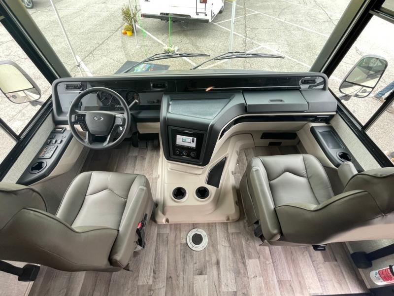 You'll love spending time with your favorite people in this Vision Class A gas motorhome! You can roam freely while inside thanks to the two slides, and the main living area has a booth dinette and 68" jack-knife sofa for relaxing. You can also turn these pieces of furniture into beds at night, and if you add the optional drop-down bunk above the cab, you'll have even more sleeping space. In between the two cab seats you'll find a removable cockpit table so that you can keep some snacks next to you as you travel. The rear private bedroom features an RV king bed within one of the slides so that you can get to the wardrobe, and a full bathroom is right there next to the bedroom for easy access to enjoy a refreshing shower.