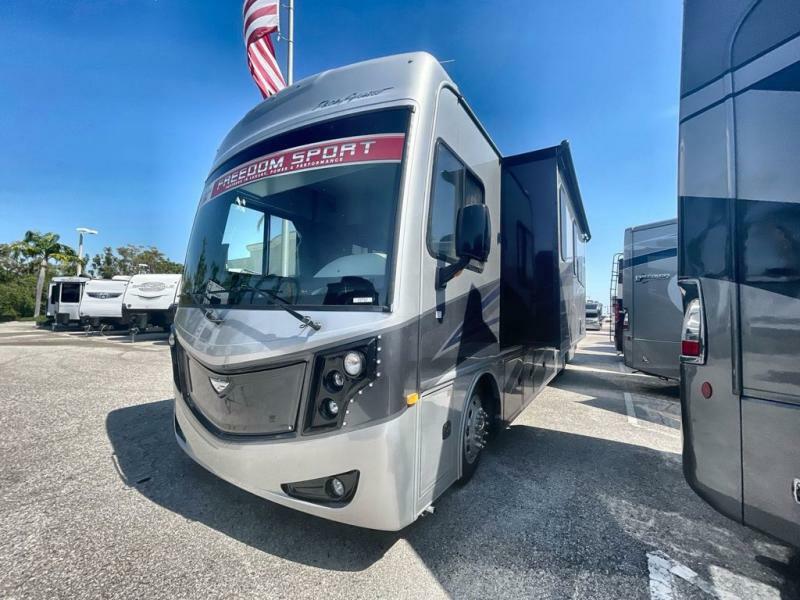 With any Pace Arrow Class A diesel motorhome, the exterior provides the Freedom Sport Foundation, a powerlock system, interlocking floors, walls and roof, auto leveling jacks for easy setup, a full-pass through storage with lighting for easy access day or night, and dual, ducted 15,000 BTU roof ACs with chill grill and rear heat pump for maximum comfort. Enjoy safer, smoother stops with the BrakeSync supplemental braking system, the ability to tow a commuter vehicle, a trailer with an off-road toy or a luggage cargo rack with the 10,000 lb. rated tow hitch, and the chassis integrated air supply for your tow vehicle brake system. The interior offers an electronic information center, composite tile flooring, full kitchen and bath amenities, plus so much more!
