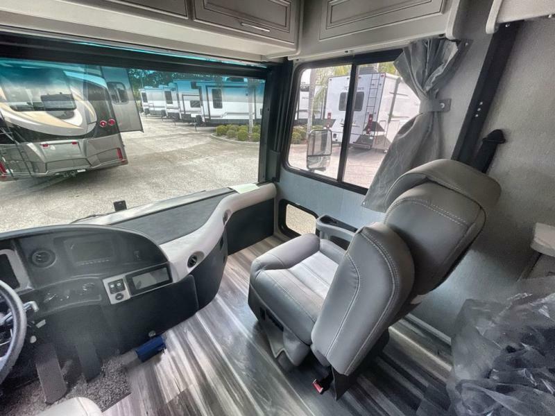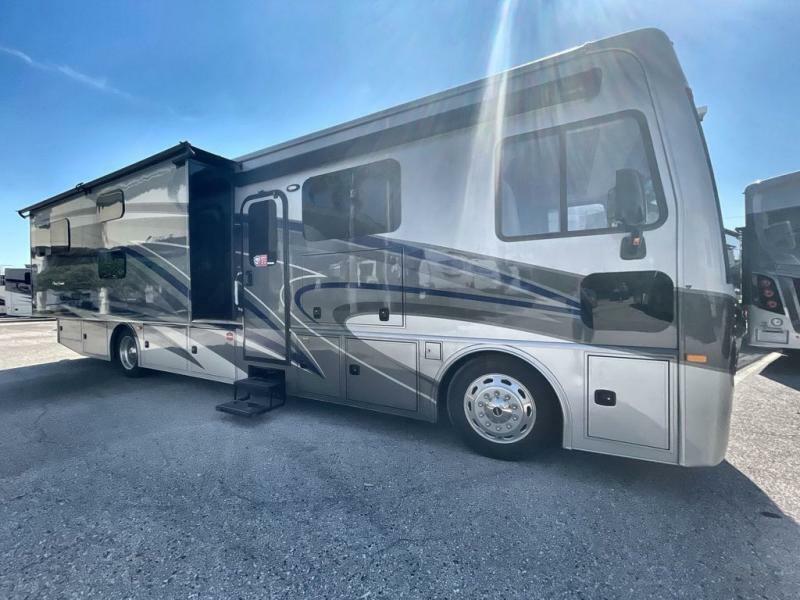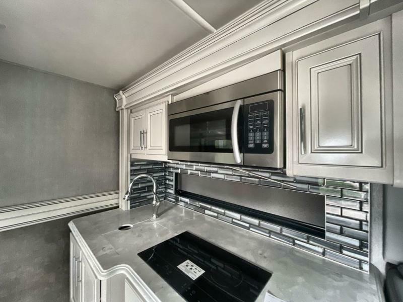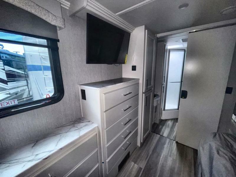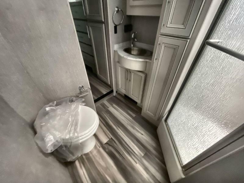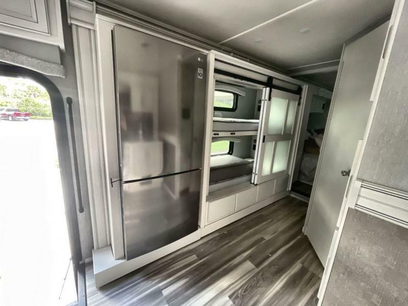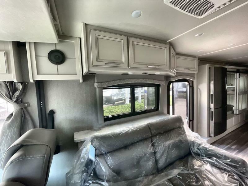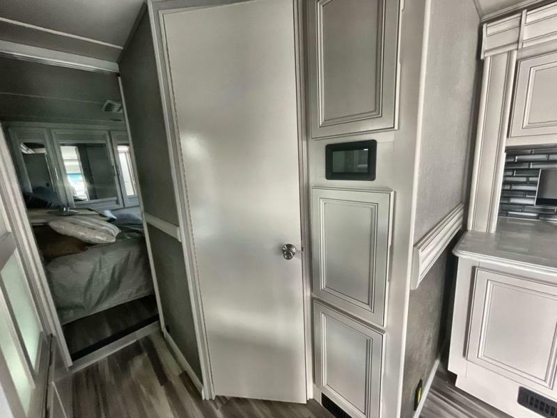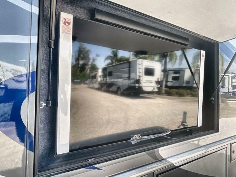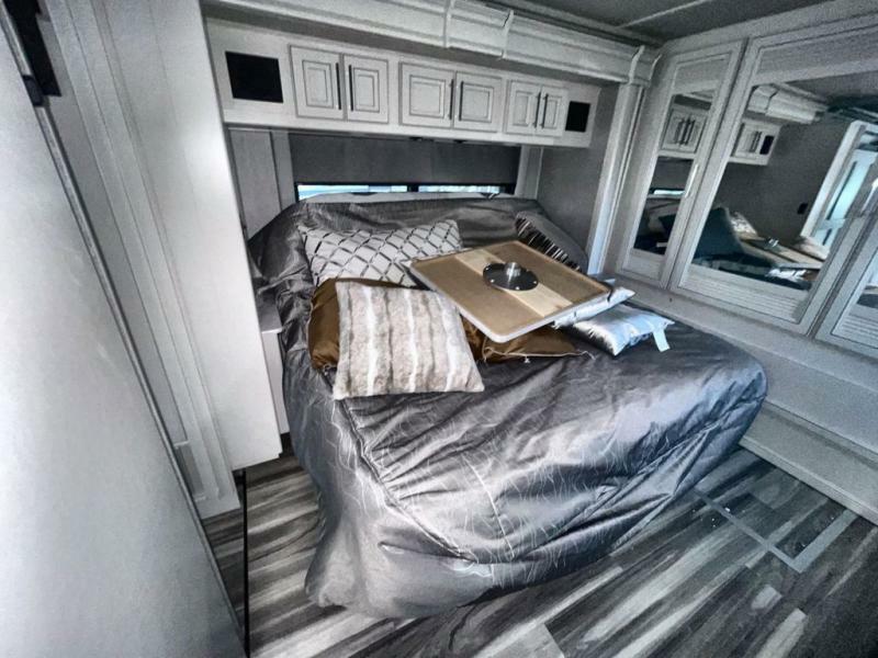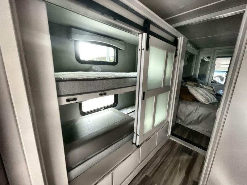 If you'd like to have space for additional guests, the 35BP might be the Pace Arrow for you! The rear queen bedroom provides privacy and offers wardrobes that span the full width, plus additional storage like a dresser and CPAP storage over the bed. In the hall are a pair of bunk beds hidden behind barn doors, and the top bunk can flip up to be used as additional storage for hanging items. A dual-entry bath is conveniently accessible from wherever you are. Up front you'll find a jack-knife sofa with footrests so you can kick back and relax at the end of the day. Or enjoy a meal or some conversation at the Dream Dinette, which can be converted to yet another bed if you need. TVs are located in the living room and bedroom as well as the exterior entertainment center with Bluetooth soundbar.