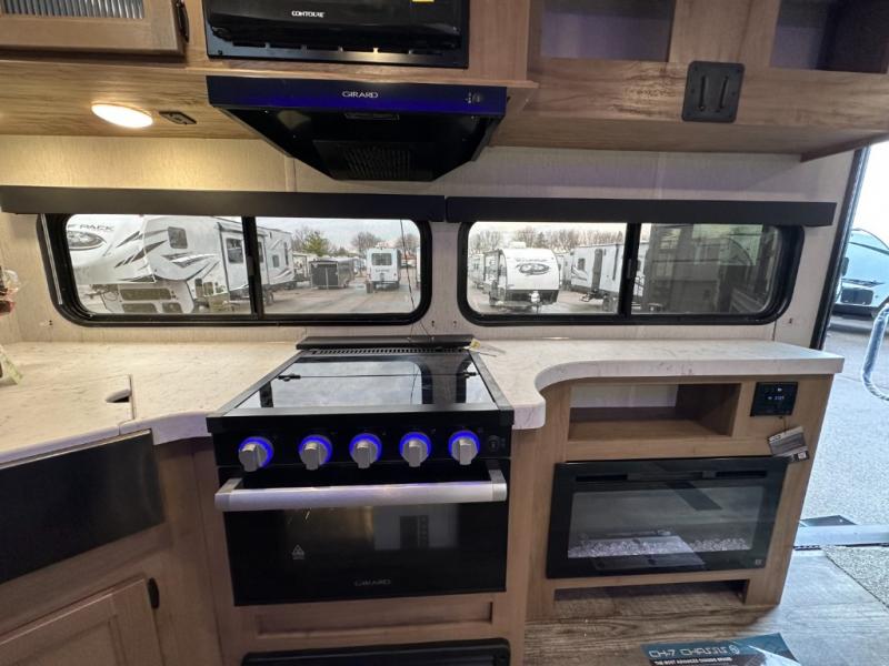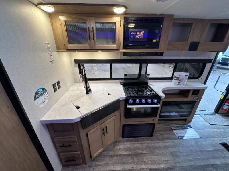 - Farmhouse-style solid-surface countertops & 11 cu ft 12 V fridge