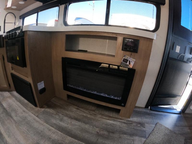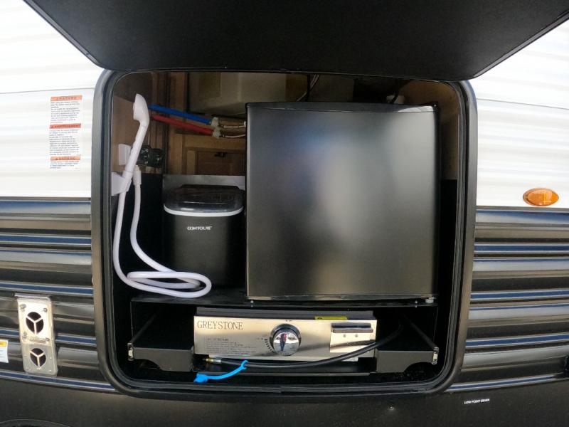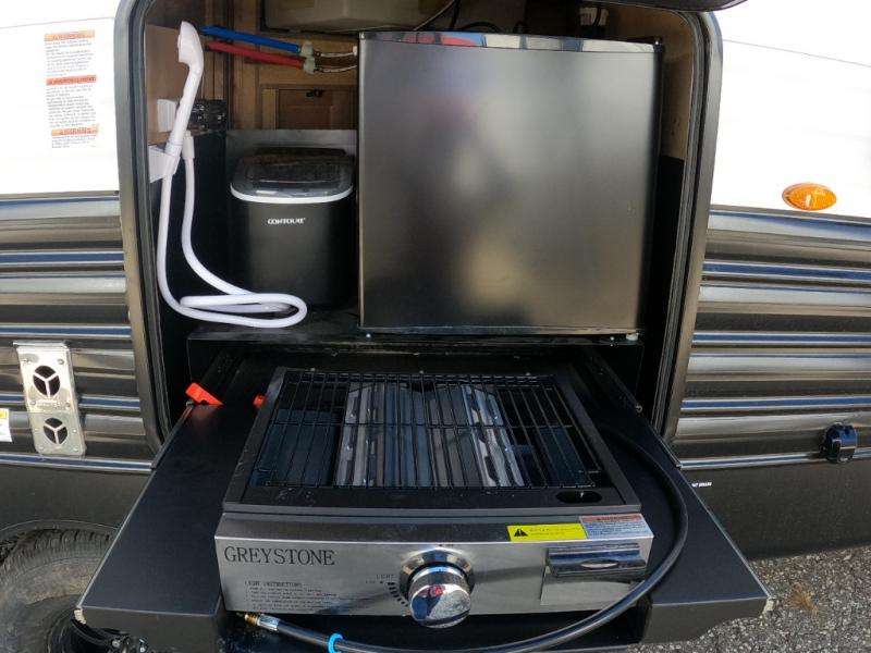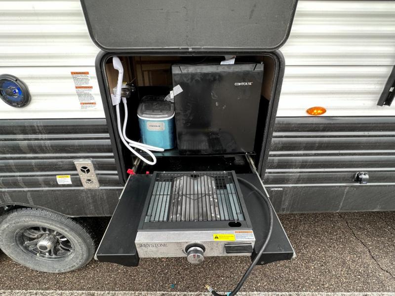 - Chef & outdoor ready: Center kitchen features 11 cu ft residential refrigerator, three-burner cooktop, skylight, plus exterior kitchen under 15' awning