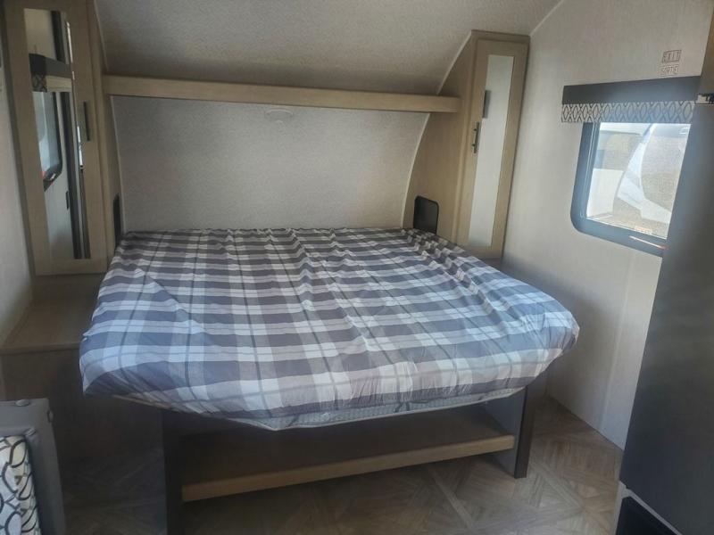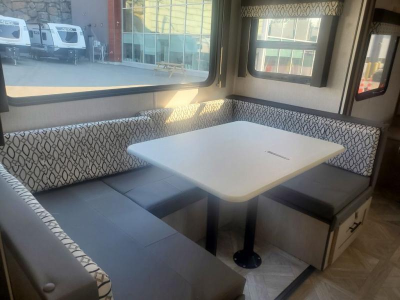 This is a great couples trailer with a semi-private front bedroom with a queen bed and dual wardrobes, plus windows for great views and ventilation when you want fresh air while you relax. There is a slide out U-shaped dinette for dining, and a galley kitchen and a full bathroom with a space savings radius shower. Yet a family of four would also love this spacious yet compact trailer by utilizing the dinette as sleeping space. And don't forget about the 14' power awning that offers protection from the elements while relaxing outside on your camping chairs.