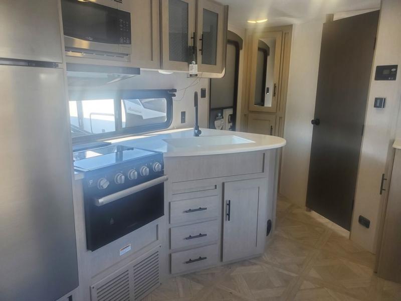 With any EVO Lite travel trailer or toy hauler by Forest River, there are features that provide function and convenience such as the power tongue jack, the stabilizer jacks, and the exterior Convenience package with a friction hinge entry door and magnetic latches on baggage doors, plus the SolidStep double step entrance. Inside you will love the look and durability of the solid surface countertops, the upgraded appliance package, and the extra large panoramic window package in the main slide that brings the outside in offering amazing views of your surroundings. Choose an EVO Lite today!