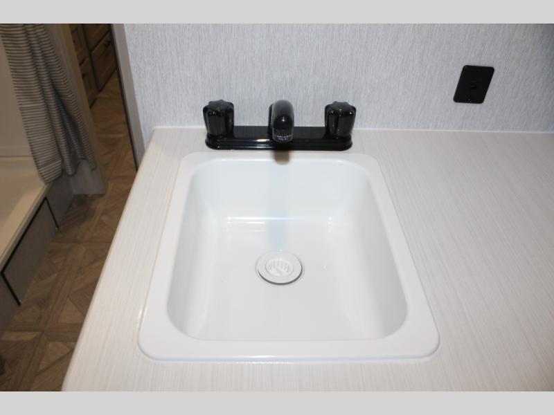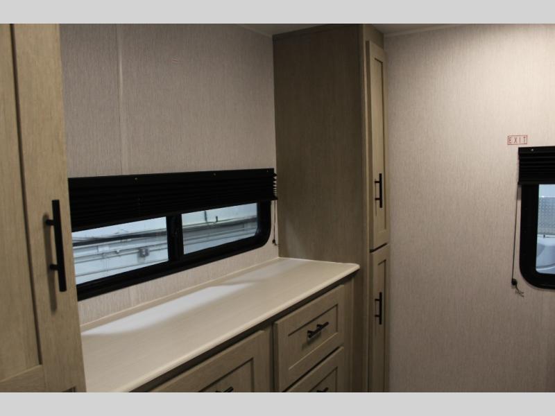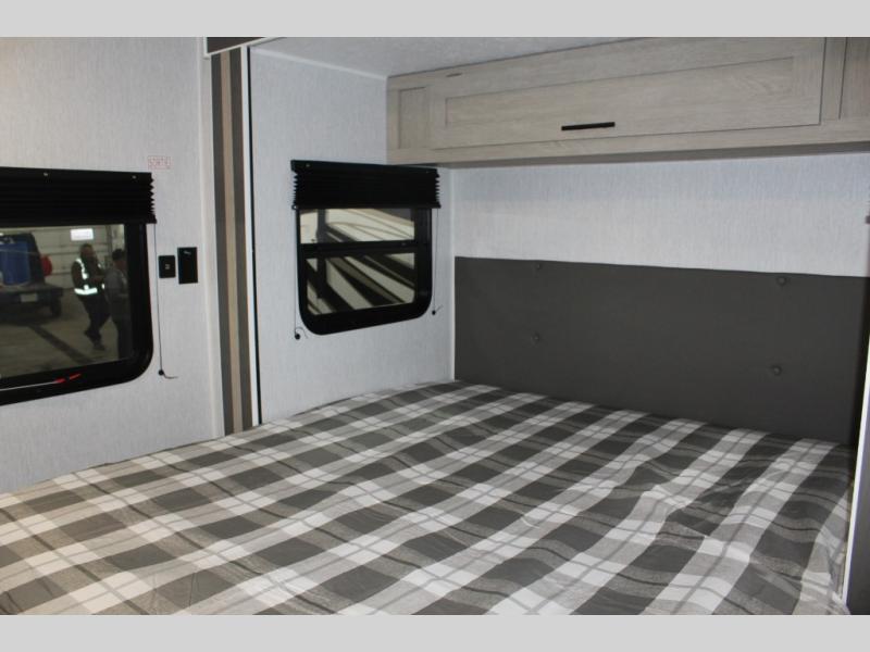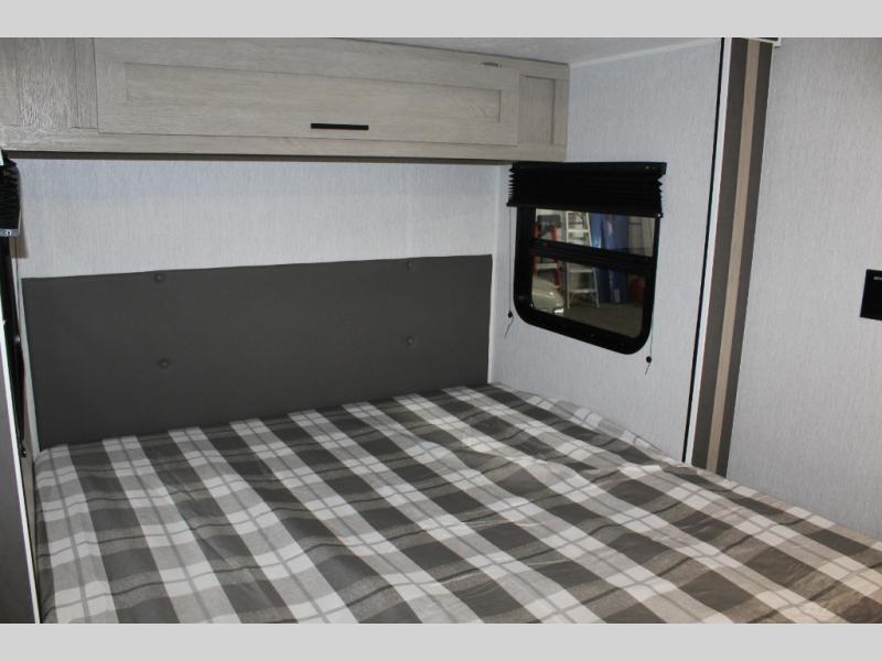 Pack your bags and have a fun weekend in this travel trailer! The rear private bedroom has a queen bed slide and across from it is a dresser with a TV above it and wardrobes on either side for your clothes. The separated bathroom gives one person privacy as they freshen up in the shower while another uses the private toilet and sink. After you have enjoyed a delicious home cooked meal at the U-shaped dinette, you can either play a card game or transform it into an extra sleeping space before heading outside to relax under the 15' power awning!