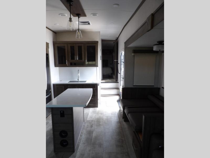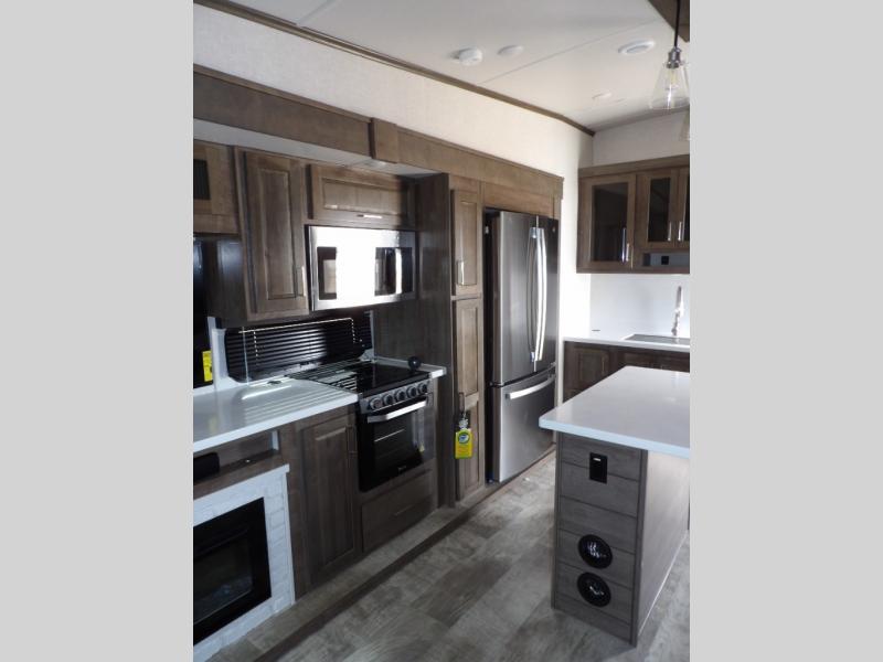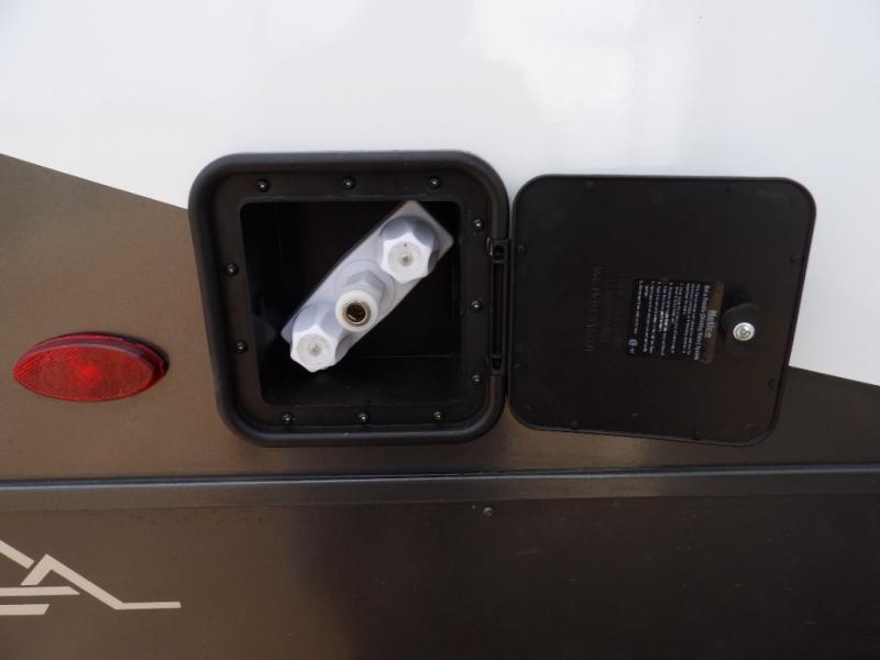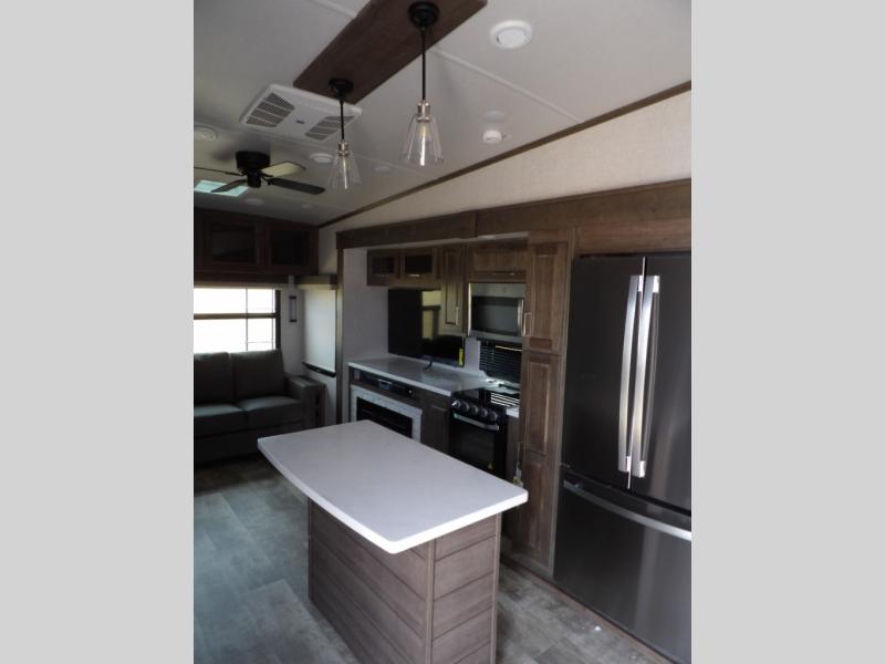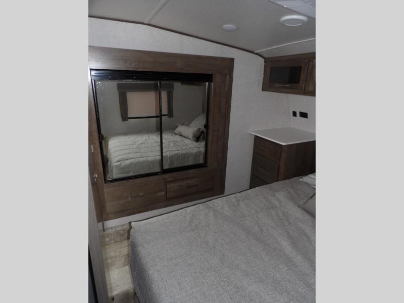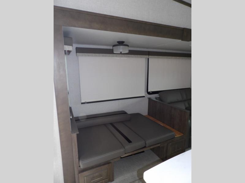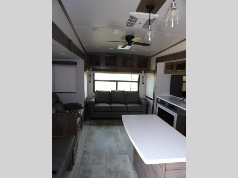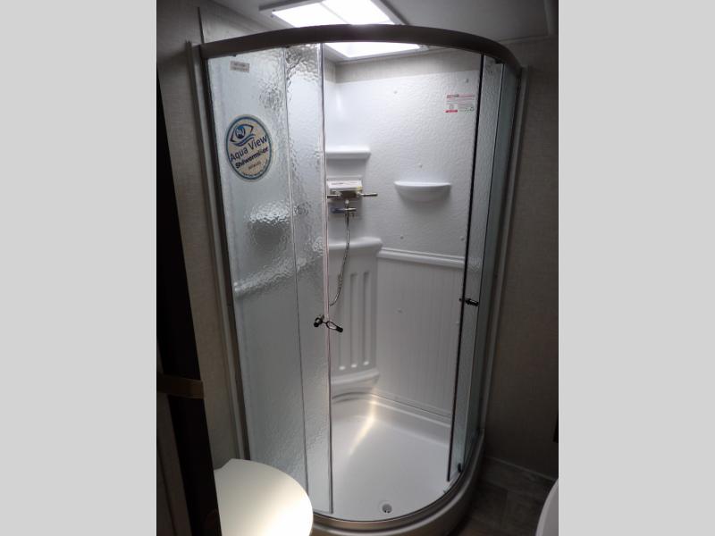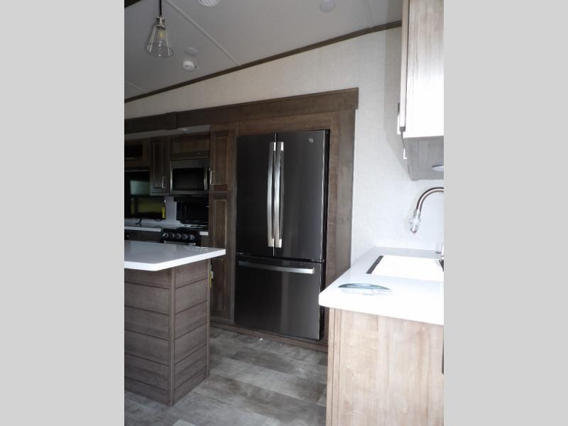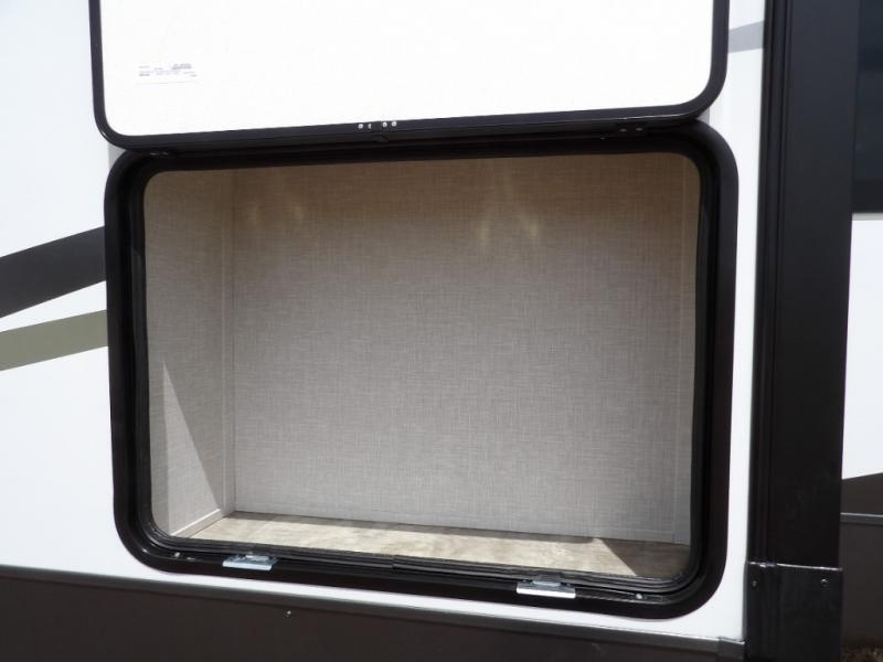 If your goal is to enjoy nature's scenery, the enormous windows in both the rear and door side slide will dazzle you. The living area in this great model will accommodate nine seating comfortably. The large refrigerator and island kitchen you can feed all 9 as well. This model is standard with a queen bed and wardrobe slide. If you want to enjoy the vistas on your camping excursions this is the model for you.