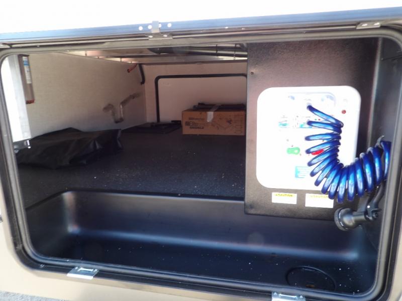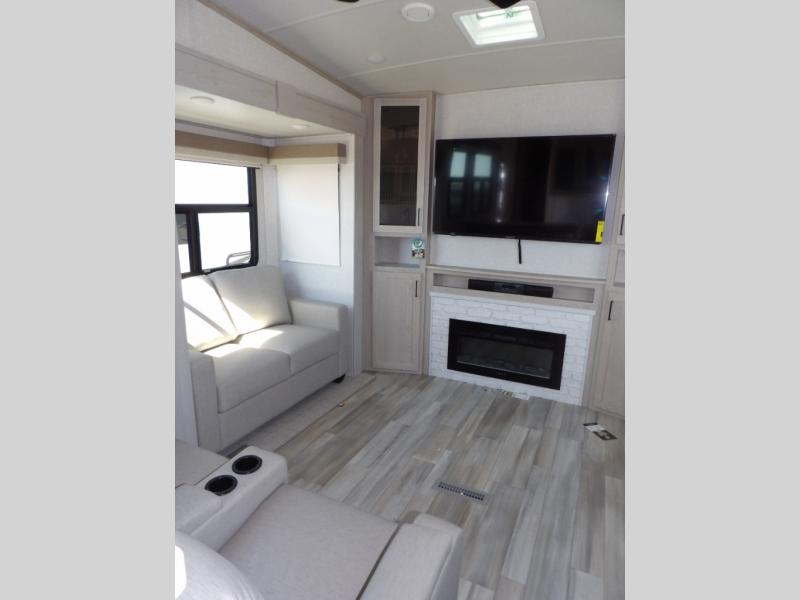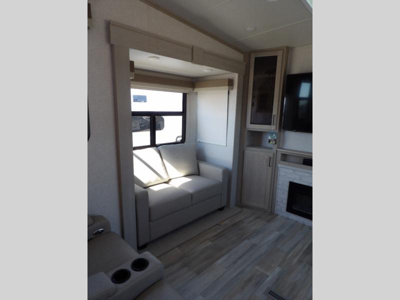 Where will you go next? Let this Flagstaff Classic fifth wheel take you on a new adventure! There is great relaxation from the hide-a-bed sofa, 60" theater seat, and 39" dinette, and the LED TV and fireplace provide some extra comfort. You'll also be able to stay cool during the hot summer when you switch on the ceiling fan. Next to the pantry you'll find a curio cabinet for storing your dishes, and you'll love using the kitchen island for creating meals. There is excellent storage on this unit with the two exterior storage compartments as well as the pass-through storage, and you even have more storage in the bedroom with the under-bed storage.