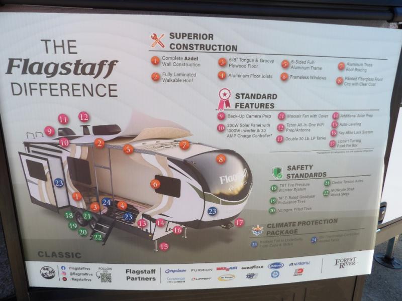 Each one of these Forest River Flagstaff Classic fifth wheels or travel trailers will be your home on wheels! Their quality craftsmanship and attention to detail shines through the surface-coated steel I-beam frame on fifth wheels, the enclosed underbelly, the radius roof with vaulted interior ceilings, and six-sided fully aluminum-framed floor, walls, and roof. Towing your unit will be easy with the torsion axle, Rubber-Ryde suspension, power tongue jack, and nitrogen-filled Goodyear Endurance tires. You will even reduce your use of water with the Showermiser water saving system in the bathroom. A few other convenient features you will enjoy include a control panel with WeRV app control, an upgraded backlit headboard, and an outside shower with hot and cold water. Come choose your favorite one today!
