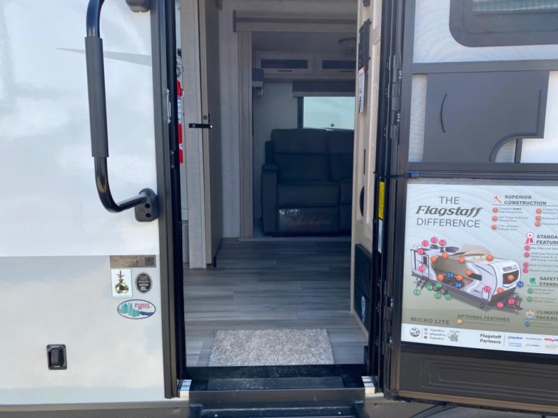 For the couple who enjoys a weekend camping trip, come choose this Flagstaff Micro Lite travel trailer. This unit features a slide that holds the theater seats with cupholders for your favorite beverage. You'll love relaxing on these in the evening while you enjoy your entertainment center with an LED TV. The private front bedroom includes an RV queen bed and a wardrobe slide. You'll love the cute kitchen with a countertop extension for meal prep and a large pantry to hold your favorite snacks. This trailer also features a drop-frame pass-through storage for your large camping items.