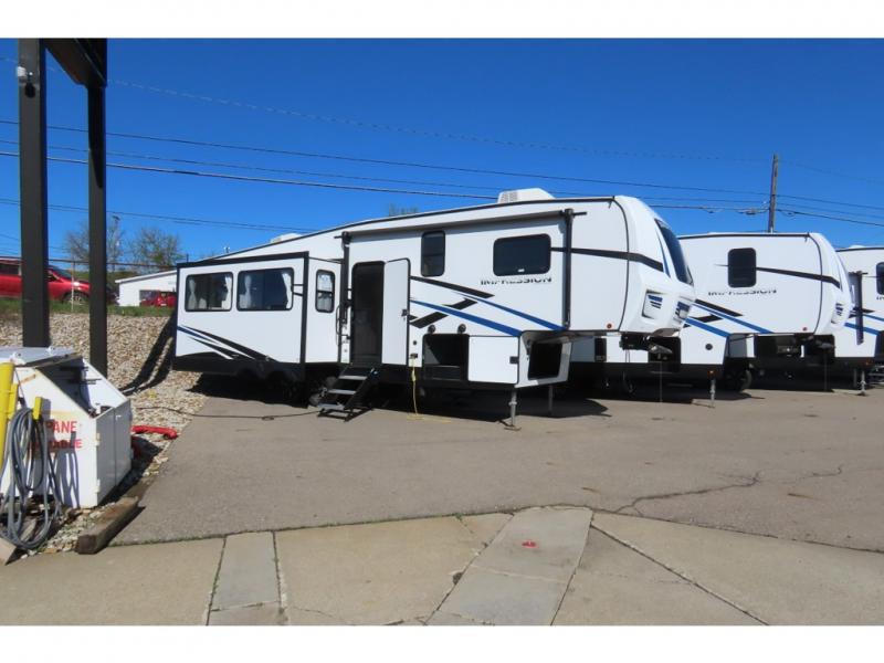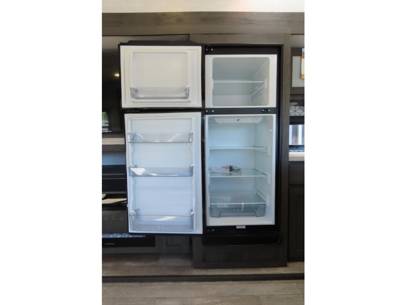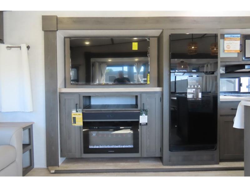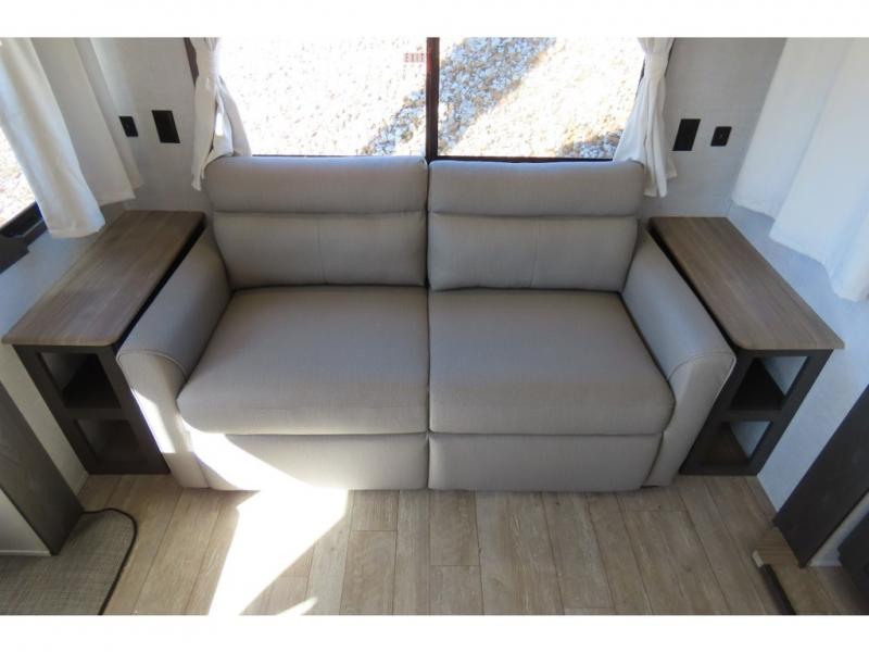 Enjoy camping each and every trip when you have this Impression at the campsite! The cook will love all the kitchen amenities including the walk-in pantry for loads of dry good storage, the kitchen island to prepare and serve meals from, and the 10 cu. ft. refrigerator. There is dining at the free standing table with chairs, or you can sit on the theater seats or even the rear tri-fold hide-a-bed sofa. Up a few steps you will find the full bathroom with a walk-in shower and skylight for more headroom and natural lighting. The bedroom up front offers four wardrobes and one is prepped for a washer/dryer option, and one is within a slide providing more floor space.