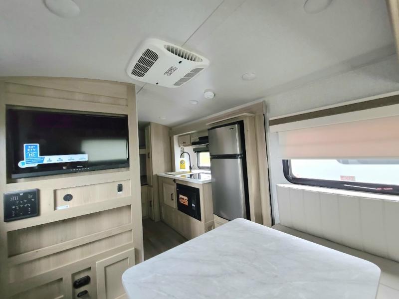 This travel trailer with bunk beds will be perfect for family camping or weekend trips to the lake with friends. There is a U-shaped dinette up front that can convert to a 54" x 82" bed and plenty of overhead compartments for your belongings. The chef of your group can prepare meals on the three burner cooktop within the slide out, and there is a wardrobe by the bunks for extra storage. This model also includes a full bath with a foot flush toilet, a Shower Miser Water Saver, and a Maxxair ventilation fan to keep everything fresh.
