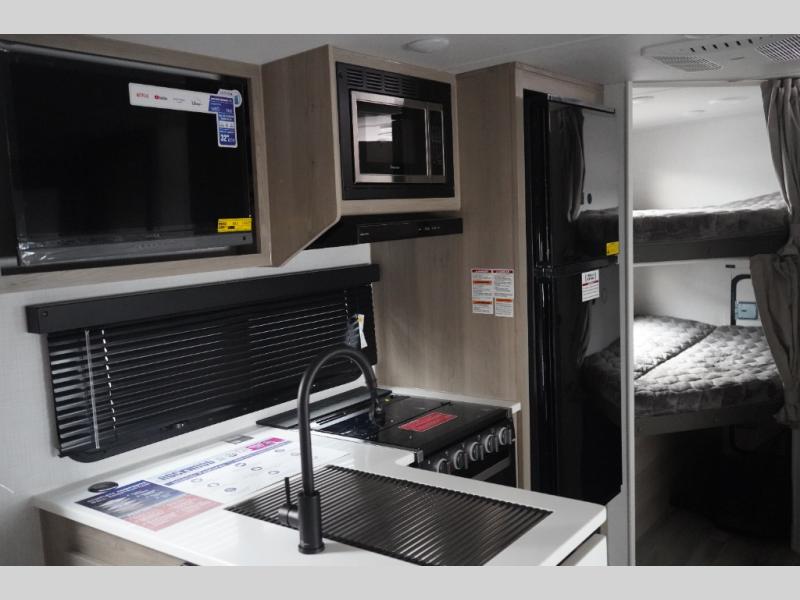 Finally, a lightweight travel trailer with double-size bunks for the kids or your guests! You'll find the versatile Murphy bed up front will be super convenient when you need more space to move around, and the 72" sofa will provide comfy seating space when the bed is put up. This model also includes a U-shaped dinette slide perfect to dine around, play games, and sleep additional guests. An LED TV in the main living area will allow you to watch your favorite shows in the evenings, or you may just find yourselves outdoors under the 18' power awning with LED lights. And check out the pass-through storage, plus additional exterior storage for your hiking gear!