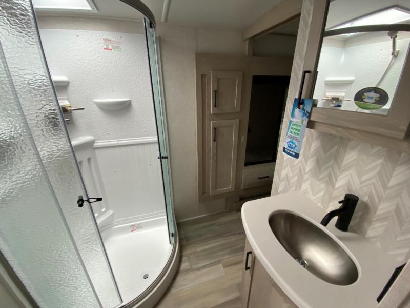 When you camp, why not have enough space for all your RVing friends to visit? This RV offers the perfect living and kitchen area with a large slide giving everyone more floor space, plus there is a king U-shaped dinette and a hide-a-bed sofa to sit on, a fireplace to enjoy and an LED TV to watch a game or movie together. The cook will love the rear kitchen with extra counter space along a side wall to leave all the snacks and treats for everyone. You might even take everyone outside to enjoy the 20' power awning that offers an outdoor living area with some protection and LED lighting, just grab your camping chairs from the pass-through storage. There is an outside griddle to utilize as well. At night, you can retire to the front bedroom with a queen bed and a wardrobe slide that stretches into the double entry bathroom and includes linen storage.
