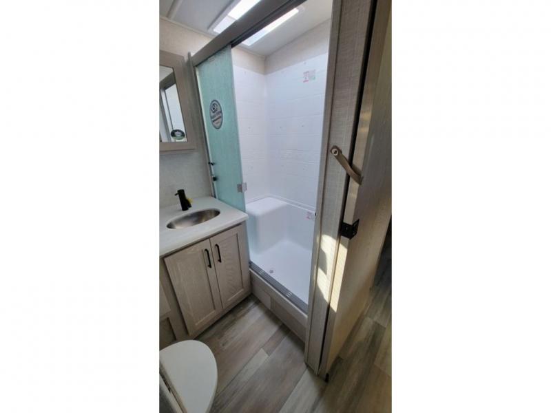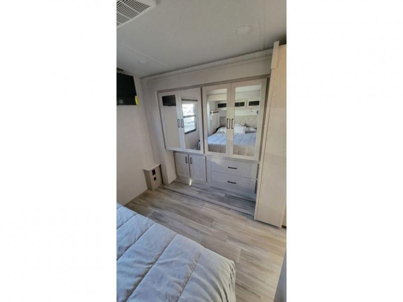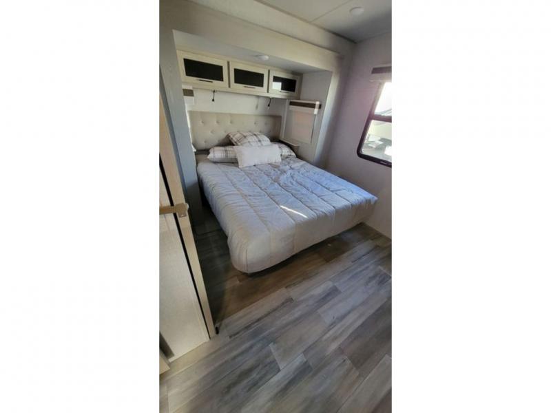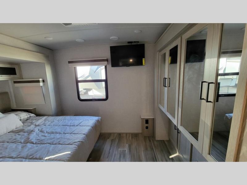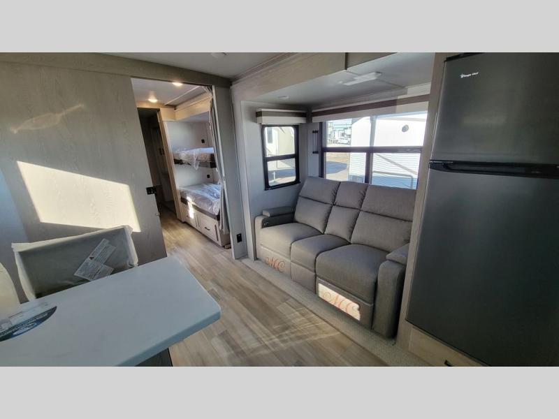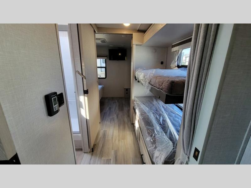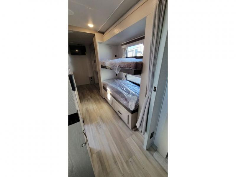 The perfect small family coach with a private bedroom and hallway bunks for the little ones directly opposite a spacious bath is not only practical but convenient. You will love this Signature model with front kitchen including countertop seating for two, plus all of the amenities you need to make meals while you are camped. You will also love the outside griddle tucked under the 21' awning for morning pancakes or to fry up your bacon to keep the strong smell outside. Relax on 67" theater seats with a TV opposite just to the right of the entry door. At night, head to the private bedroom with space saving sliding door for a great night's sleep on the queen bed, and keep all of your clothing neatly tucked away in the wardrobe/linen closet opposite, both are found within a slide creating added floor space for moving around. The many exterior storage spaces allow you to take along all that you might need without worrying about enough room.