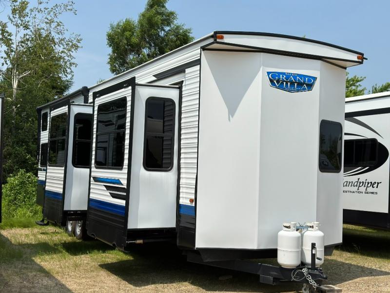 You will experience a home away from home with any one of these Forest River Salem Grand Villa destination trailers! Their construction consists of a 12" forged I-beam frame, a cambered chassis, and plywood floor decking, as well as 5" bowed truss roof rafters, 3/8" roof decking, and color coded water lines to make life easier. The one-piece, seamless slides and 106" interior living room height makes for more walking around space. A Best in Class Value package includes upgraded designer furniture, a central vacuum with sweep attachment, and stainless steel kitchen appliances to keep your bellies full. Plus, it has a heated and enclosed Accesssi-Belly with removable panels and an exterior LED light strip under the awning. Come choose your favorite model today!