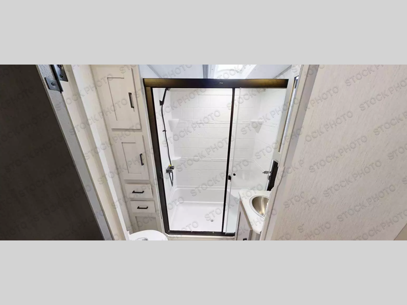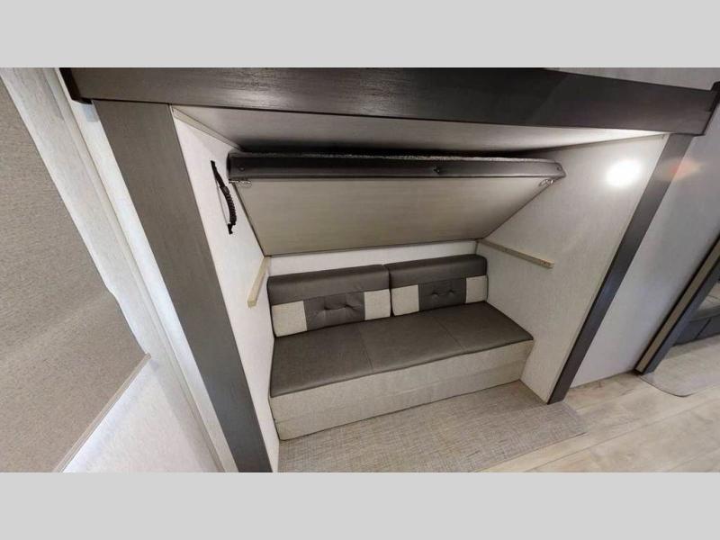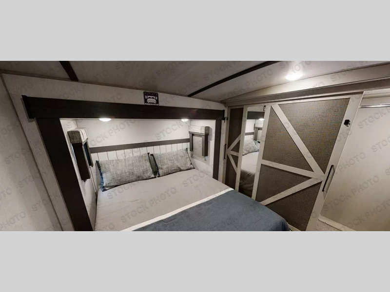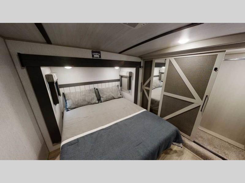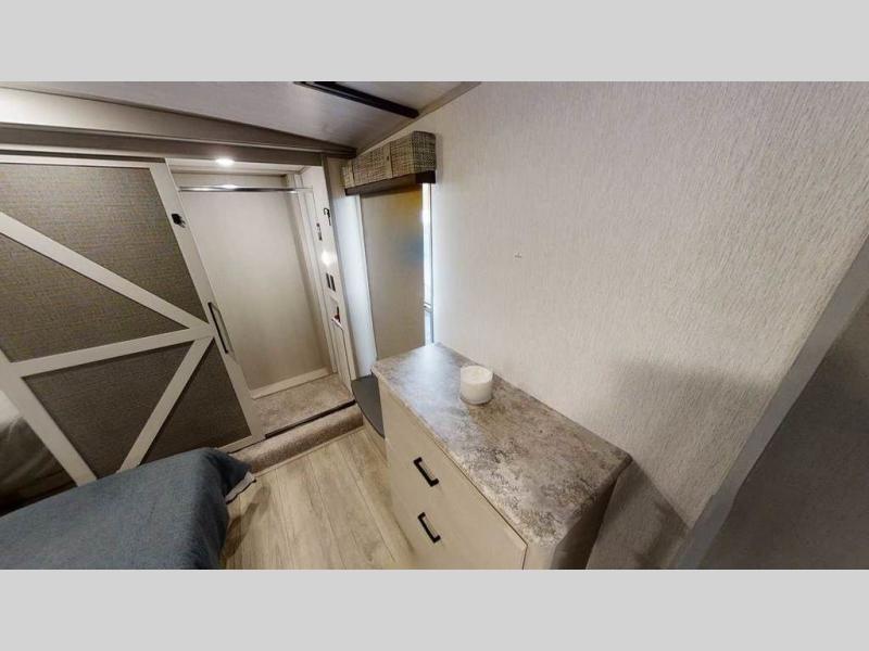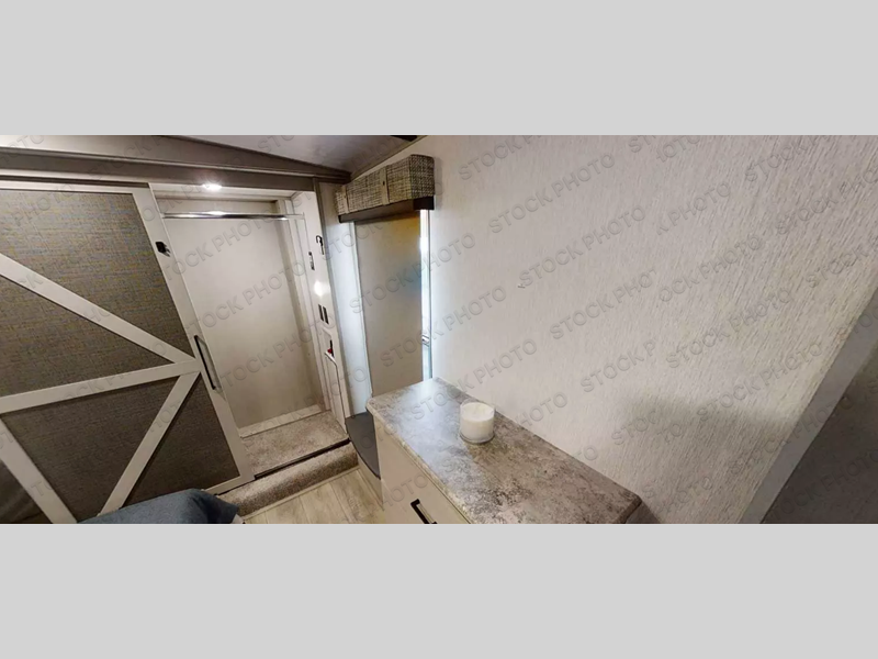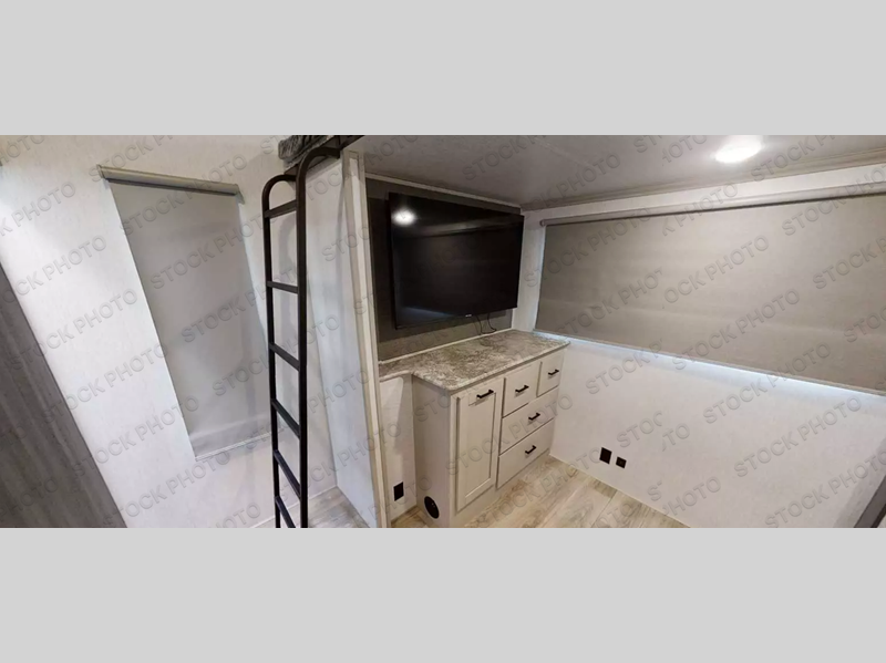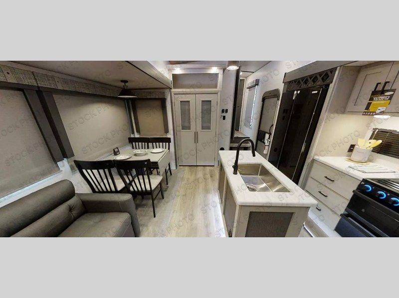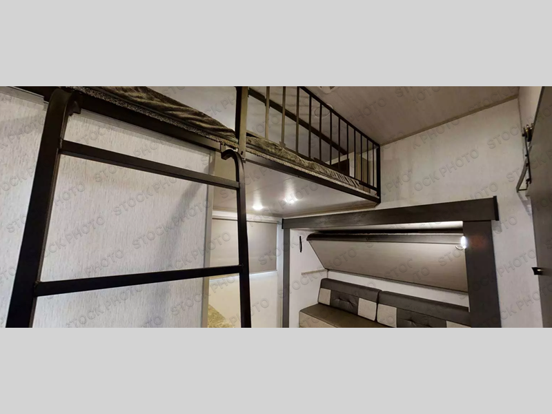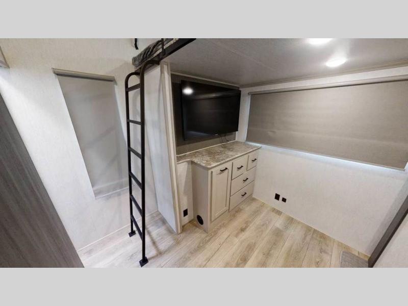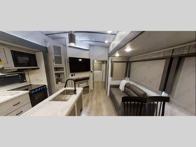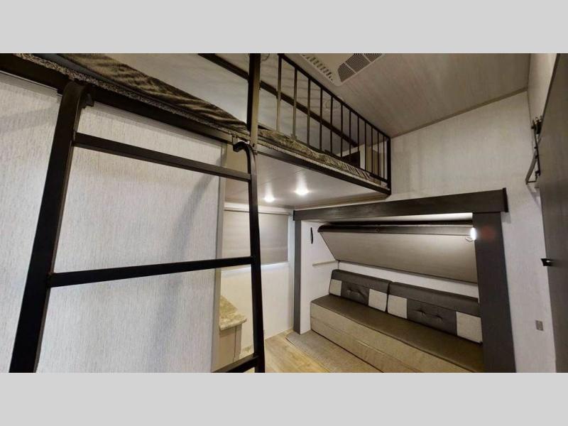 Are you looking for more space, unique features, and luxury in your next fifth wheel? Then step into this dual entry model for at-home comforts. Heading to the front you will find interior steps up to the full bath with a residential walk-in shower, and a master bedroom with a custom king bed, lots of storage and a space prepped for a washer/dryer option. The kids or your guests will love the bunkhouse with a flip-up bunk, a Versa queen convertible bed/sofa and an RV queen loft bed with a ladder. The panoramic windows throughout, the glass front electric fireplace, and the deluxe French door pantry are just a few more reasons you will love this fifth wheel! And you can cook inside will full amenities plus on the outside kitchen/bar.