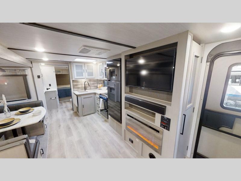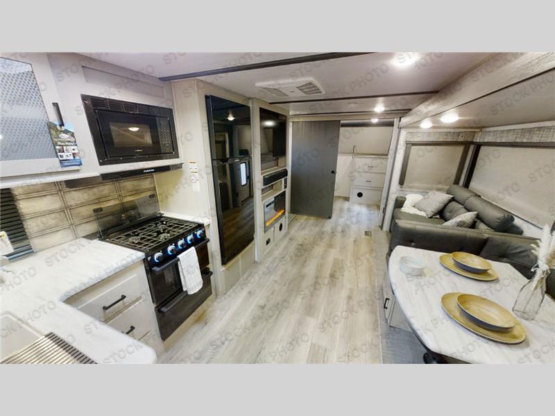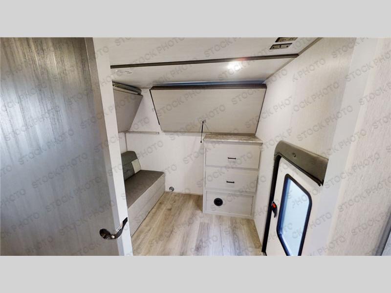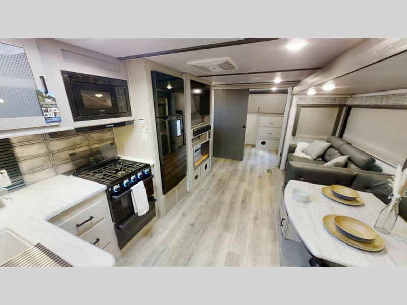 When you have this Salem Hemisphere Hyper-Lyte travel trailer, you will have everything you need for adventurous and accommodating getaways! Spend some time on the tri-fold sofa or the U-shaped dinette in front of the 40" LED TV and fireplace. If you need a little snack while you watch a movie, you can heat it up in the microwave or prepare it on the three-burner range. Grab some cold drinks from the 12V 10 cu. ft. refrigerator, and pull out the countertop extension if you need a little extra space to get your snacks ready. The rear bunkhouse is super sweet with its flip-up bunks and Versa convertible RV queen bed, and the front private bedroom will also be comfortable for you to spend your nights relaxing in.