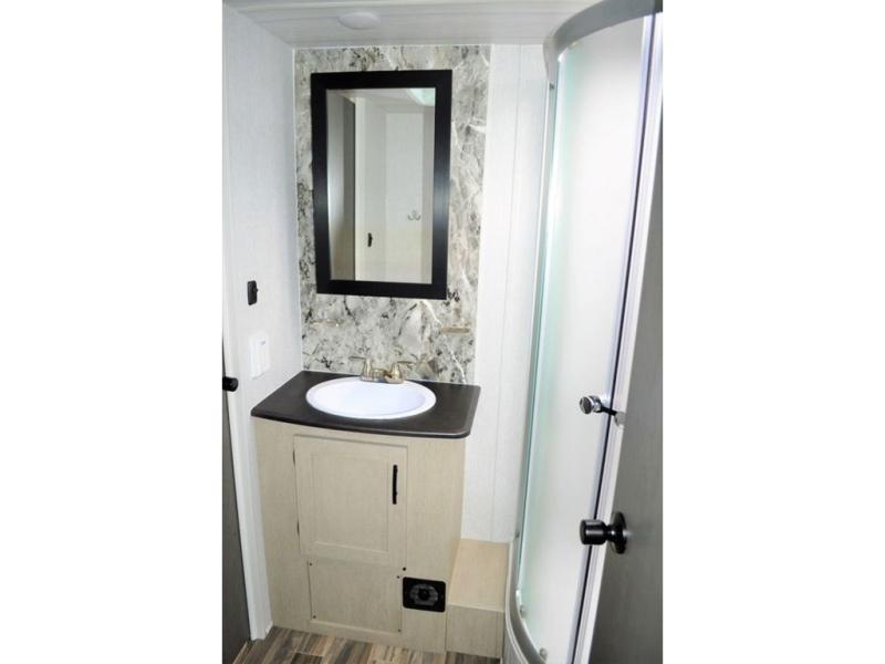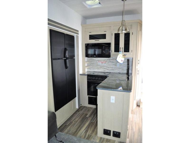 The grey 3,000 lb. ramp door with a black spoiler and 17' of cargo space in this toy hauler is ready to load up your toys when ever you are! Once you've reached your destination, you can set up the electric pass-through dinette with an electric bed above it, the chairs and table, and the flip sofa with table. The kitchen has everything you will need to prepare delicious home cooked meals and a 12.3 cu. ft. refrigerator to keep your beverages cold and perishables fresh. The dual entry bathroom is easy for everyone to access, especially those staying in the front private bedroom. It also has a fiberglass exterior that will protect your unit and turn heads at the campsite!