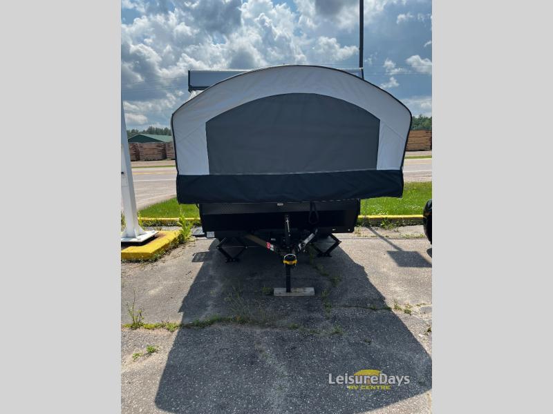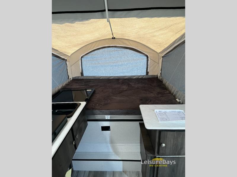 You will find comfort features all throughout this folding pop-up camper! The queen tent end insulated beds supported by Glide-N-Lock cables offer a comfortable night's rest, and you can even transform the two opposing 70" gaucho sofas into an extra sleeping space. Enjoy home cooked meals with the two burner high output range, cold beverages with the 120 watt/12V refrigerator/freezer cooler, and an easy clean up with a deep acrylic sink bowl. The new exterior style storage and shroud lets you bring more items to the campsite and the exterior awning will protect you rain or shine!