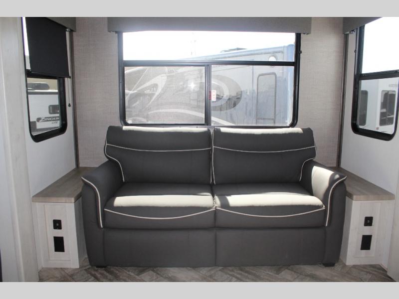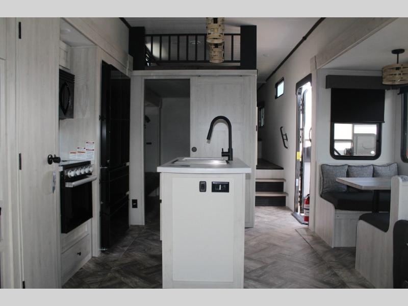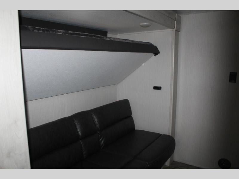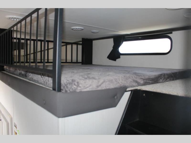 Wow check out this fifth wheel with four slide outs, a middle bunkhouse with a loft, plus two power awnings! The main living area includes 60" theater seating across from the entertainment center and fireplace, a hide-a-bed sofa, and a free-standing dinette to enjoy meals together. Your guests will love having their own space in the bunkhouse that includes a jackknife sofa, a flip-down bunk, plus a dresser and a TV. Head to the front private bedroom for a great night's rest on the slide out king bed, and there is a walk-in wardrobe with washer and dryer prep for full-time living!