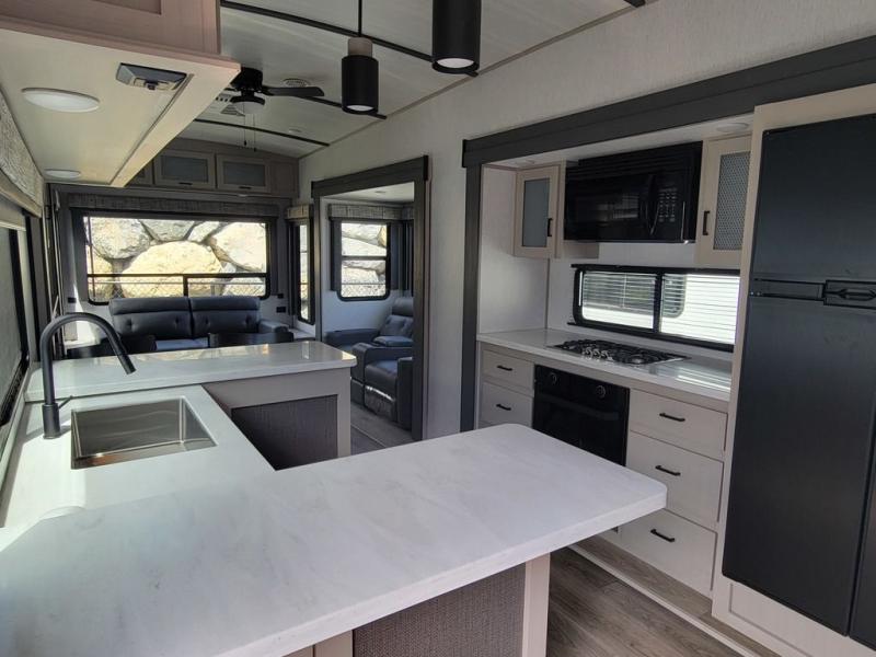 If you've never experienced affordable luxury, you're in for a treat with the Forest River Wildwood Heritage Glen Elite fifth wheel! The exterior features ivory performance colored fiberglass with smoked quartz metallic accents, a 30"-wide main entry door, a heated and enclosed underbelly/dump valves, radial tires with black-accented aluminum rims, and a shaded pet tether. The Heritage Glen Elite's luxury is clearly seen in its luxurious solid-surface kitchen countertops and Designer's Choice bedding and accent wall, and the quality continues on with the inclusion of a residential gas cooktop with a built-in oven and LED-lit knobs, 12V heat pads on all holding tanks, and a porcelain toilet.