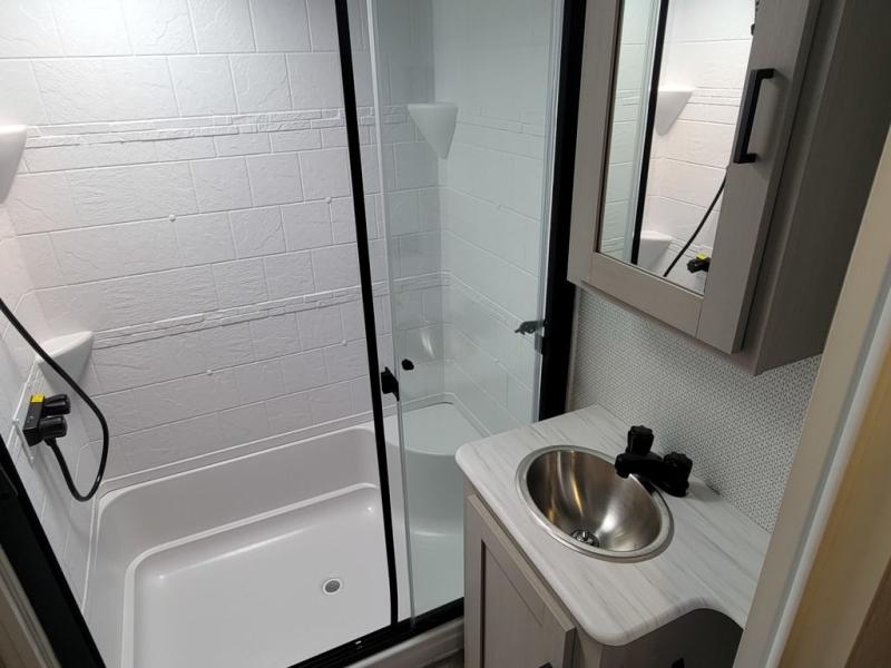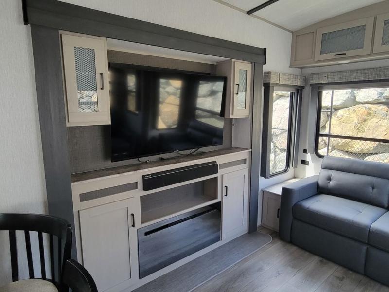 Travel in luxury with this Wildwood Heritage Glen Elite Series fifth wheel in tow! Quad slides create an open feel just like home. The front master bedroom is private and features a king bed slide, a large front wardrobe, and a dresser. A full bath with a walk-in shower including an overhead skylight will be a delight over using any campsite facilities. There is also a linen cabinet and porcelain toilet. On the main level, you will find a kitchen sink flanked by two breakfast bars each with two stools for dining. There is a deluxe French door pantry for your snacks and canned goods. The 20 cu. ft. residential refrigerator will certainly take care of your perishable items. And the rear area living space features a theater seat slide, a tri-fold sofa, and an entertainment center with 55" TV, plus a fireplace for a cozy night inside. On the outside, you will enjoy the Texas XL sized pass-through storage for all of your outside games and camping gear, an exterior 50" swivel TV, and pull-out gas grill plus refrigerator so you can grill or entertain easily under the two patio awnings. This unit can be outfitted with solar and/or a washer and dryer if you choose!