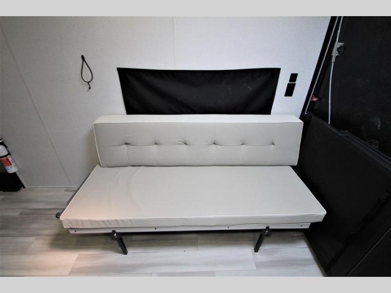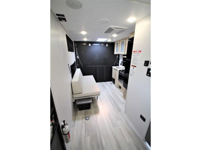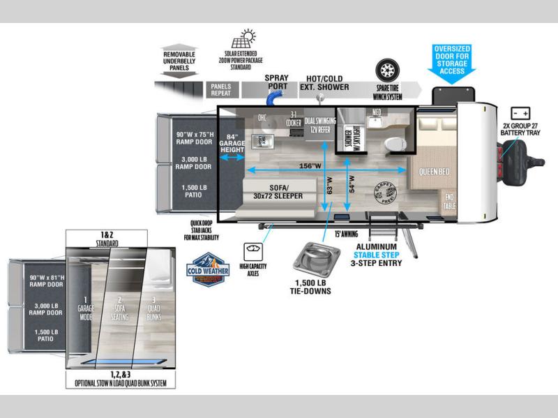 This MAX toy hauler is maxed out with features to make your adventures memorable. A dual swinging 12V refrigerator provides plenty of space to store your food, and the seamless countertops are easy to keep clean. The 8' wide interior allows you to bring along your favorite toys, and the ramp door makes unloading easier than ever. Set up the 1,500 lb. patio once your toys are out and enjoy a cold drink with friends! Your guests can sleep on the sofa/sleeper, while you take the front queen bed with storage space for your belongings. Choose the optional Stow N Load quad bunk system for even more sleeping space!