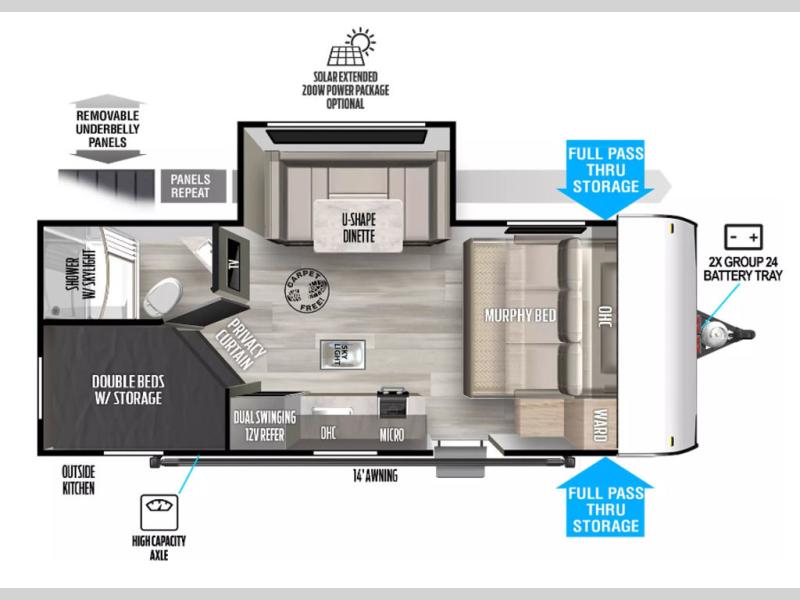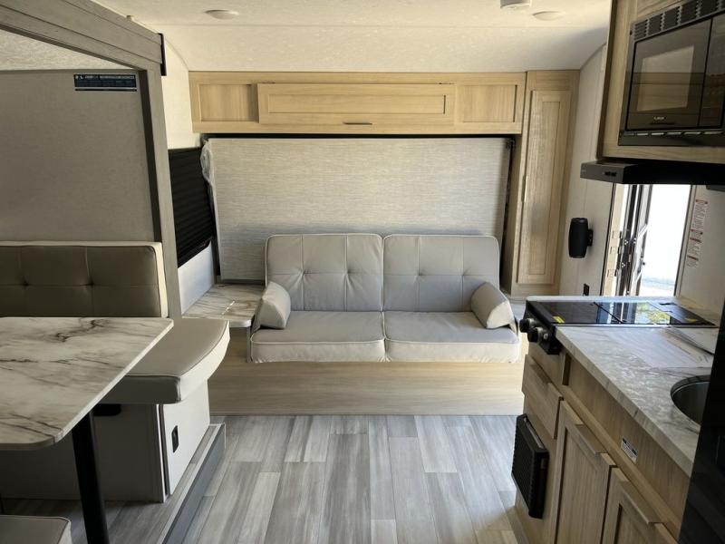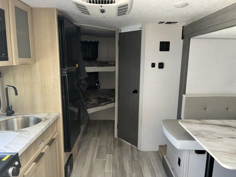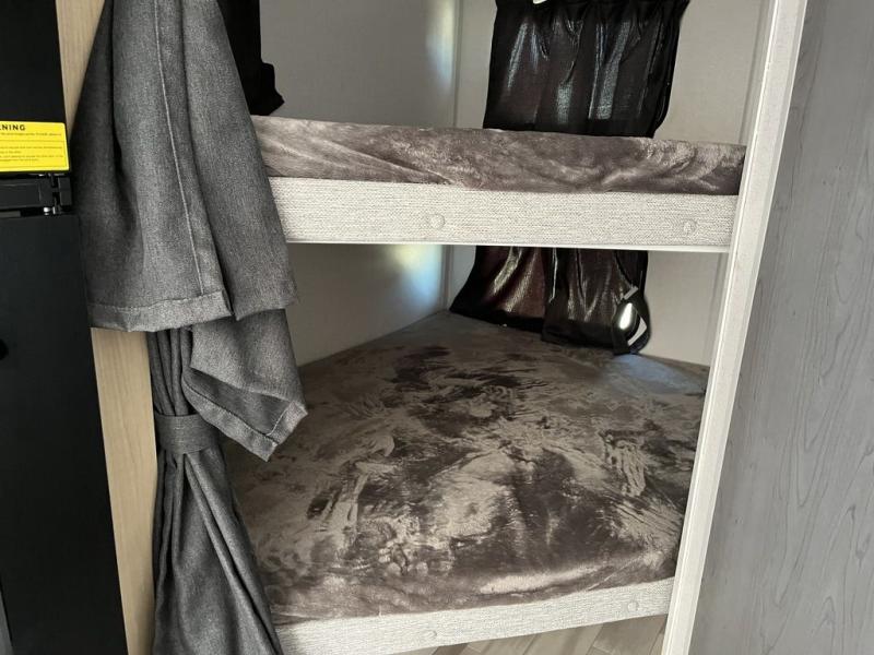 Bring your whole crew along for trips in this roomy travel trailer that can sleep eight people each night. Once you've set up the 14' power awning with LED lights, make lunch on the outdoor LP griddle, and there is an outdoor refrigerator for cold drinks. Explore some trails or take your fishing poles down to the river, then head back to the trailer to clean up in the full bath. The kids may want to rest on the double-size bunks, while the adults play a game around the U-shaped dinette. This model also includes a sofa to relax on, plus a Murphy bed that lowers over the sofa when you're ready for bed. Don't let this travel trailer slip away!