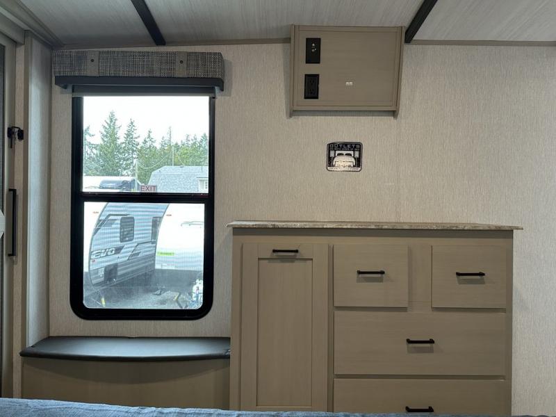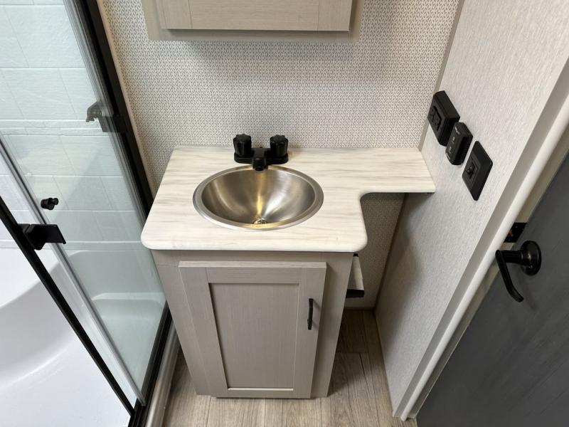 Each Wildwood Heritage Glen Elite Series fifth wheel by Forest River is constructed with vacuum bonded "Aluma Frame" sidewalls and floor, block foam insulation, and an AccessiBelly underbelly with 12V tank heaters on all holding tanks to help extend your camping season. There is an exterior docking station with hot and cold water, along with power stabilizer jacks and landing gear, and Goodyear radial tires with black accented rims. There is also an in-line water filtration system, an RV Airflow system, and an extra large pass-through storage with Slam Latch baggage doors and magnetic catches for hassle-free packing. You will love the high-end solid surface countertops inside, along with gold-accented faucets with stainless steel sinks in all bathrooms, and European oak colored horizontal plank linoleum flooring that is both stylish and easy to keep clean!
