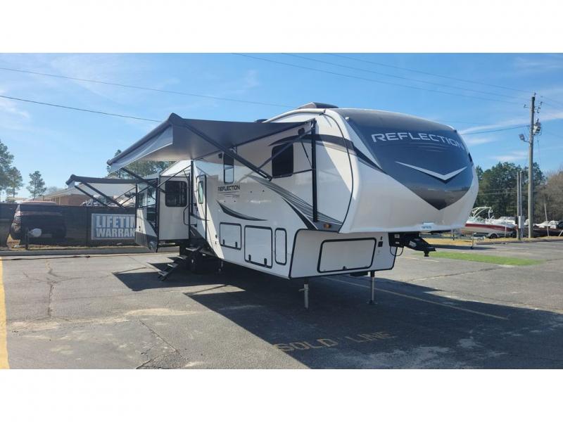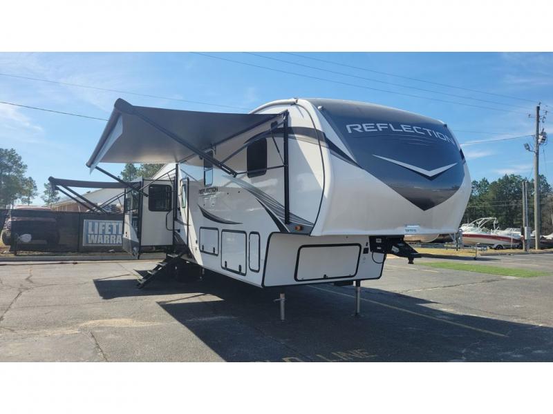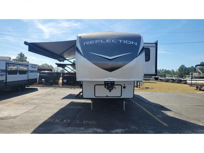 With any Reflection fifth wheels by Grand Design, you will have a 165W solar panel for off-grid camping and a 50 Amp charge controller and inverter prep, a Max Turn radius front cap for easy towing around town and into your campsite, a Universal All-In-One Docking Station, unobstructed pass-through storage, and Goodyear E-rated tires. Some other top features include a chef's kitchen with a 30" stainless steel microwave and residential cooktop, a USB charging station, and the ductless "Evenflow" heating system with no vents in the floor to collect debris. Each is constructed of high gloss gel coat exterior sidewalls, residential 5" truss rafters, walk-on roof decking, a fiberglass and radiant foil roof and front cap insulation plus laminated aluminum framed side walls, rear wall, roof and end walls in slide rooms. Choose luxury, value and towability over all the others, take home a Reflection of your good taste!