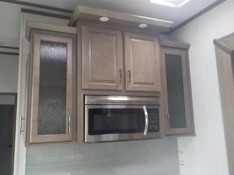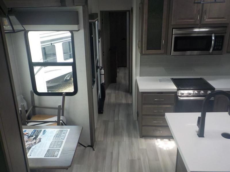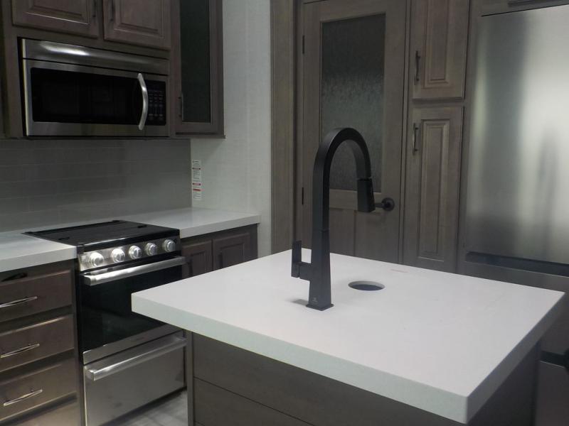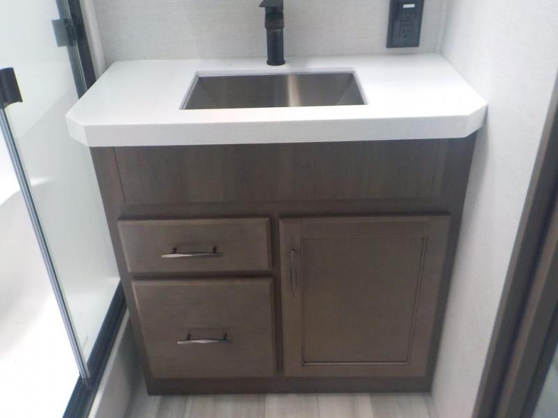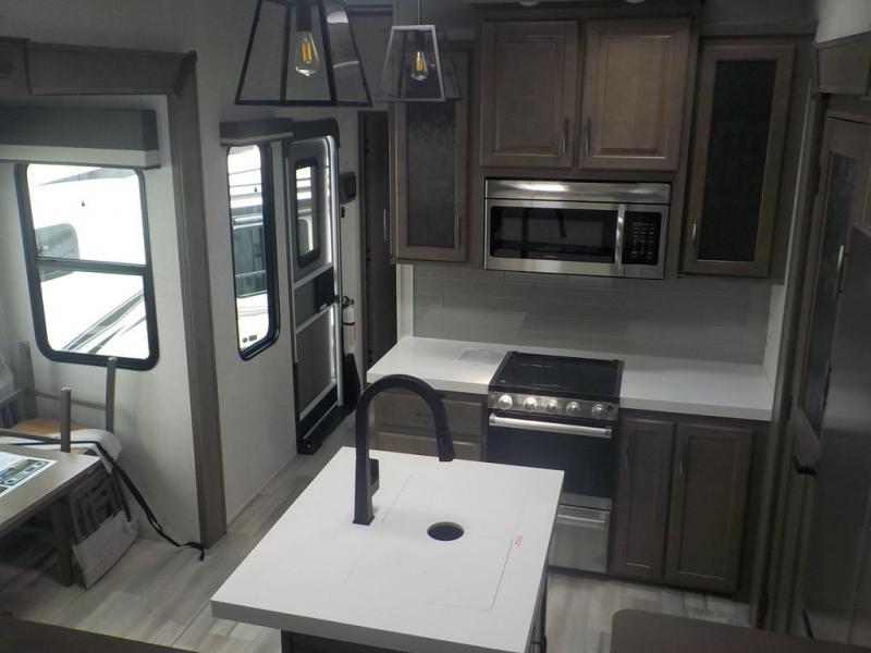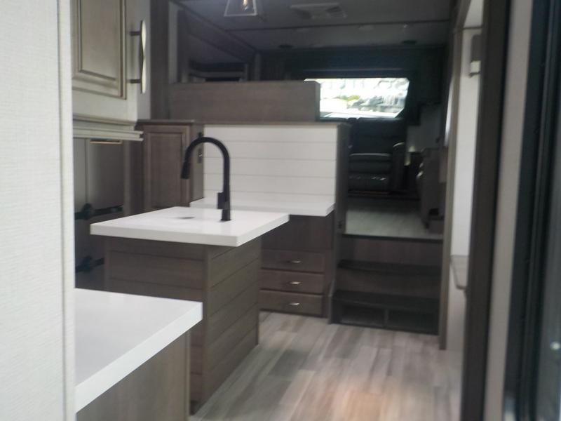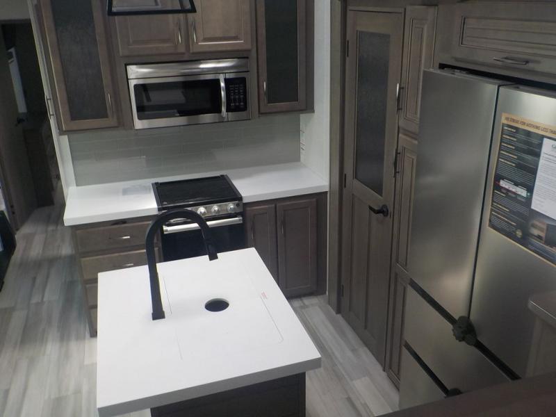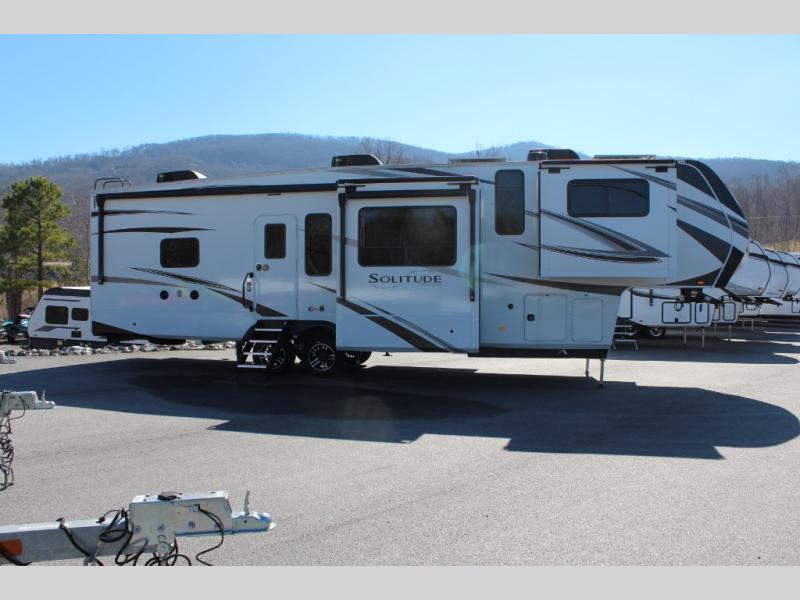 With any Solitude S-Class fifth wheel by Grand Design you will appreciate the Max Built Construction Package that features a 101" wide-body, gel coat exterior sidewalls, heavy-duty 7,000 lb. axles, plus many more durable construction materials. The self-adjusting brakes and the MORryde CRE3000 suspension system will provide a smooth towing experience, and each model includes heavy duty 17.5" H-rated tires with NitroFill. Some of the features you are sure to love are included in the Residential Living Package, like the solid surface countertops and sink covers, the hardwood cabinet doors, the night stands with USB ports, and the Rockford Fosgate stereo entertainment system with HDMI and App controls. These fifth wheels are extended-stay approved thanks to the Weather-Tek Package with a 35,000 BTU high-capacity furnace, the Stealth A/C system, and many high-end residential finishes to make you feel like you taken home with you!