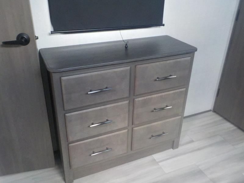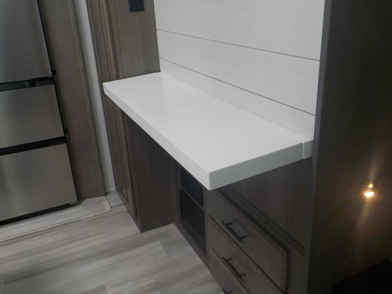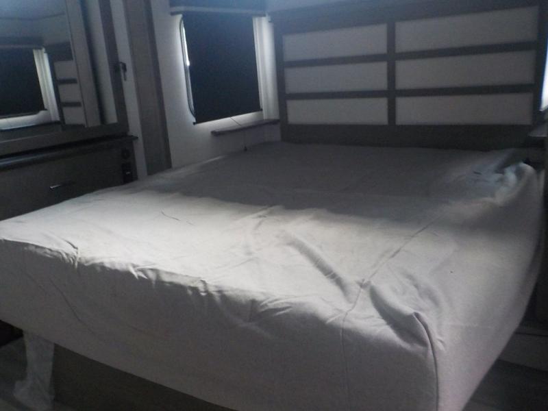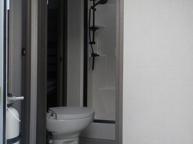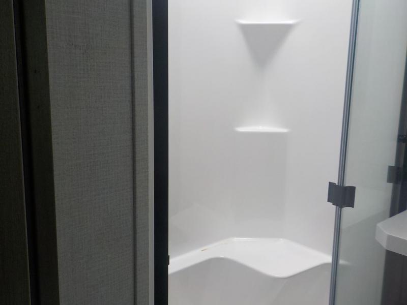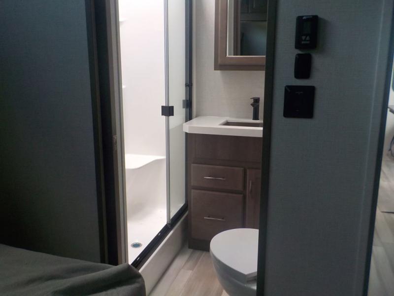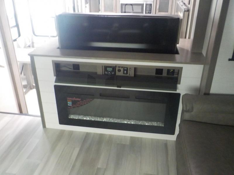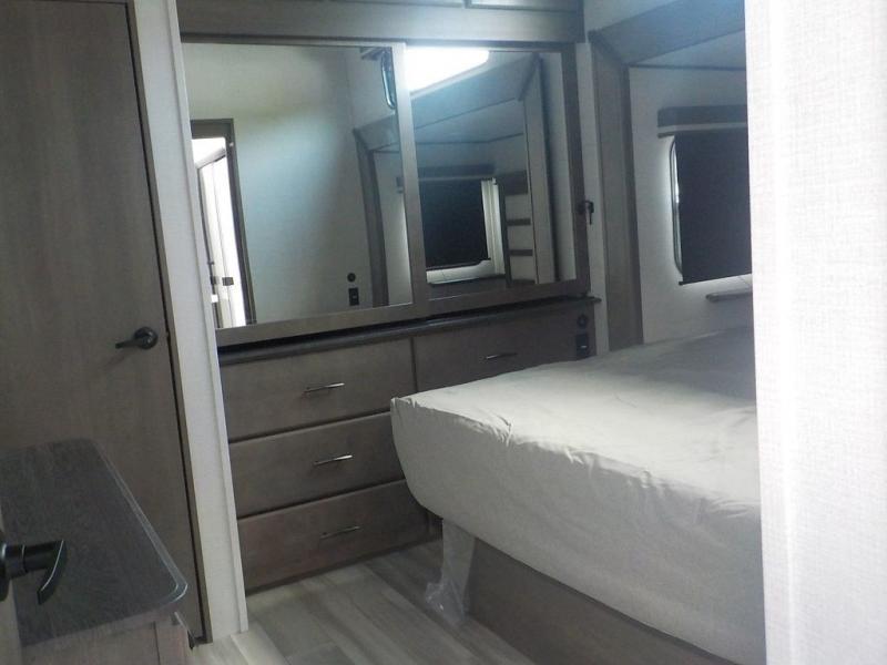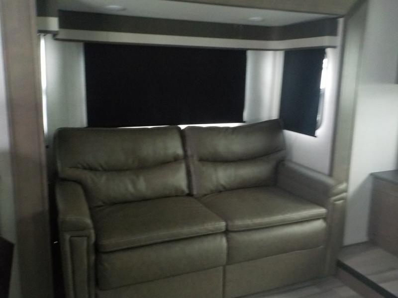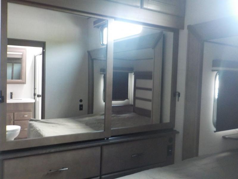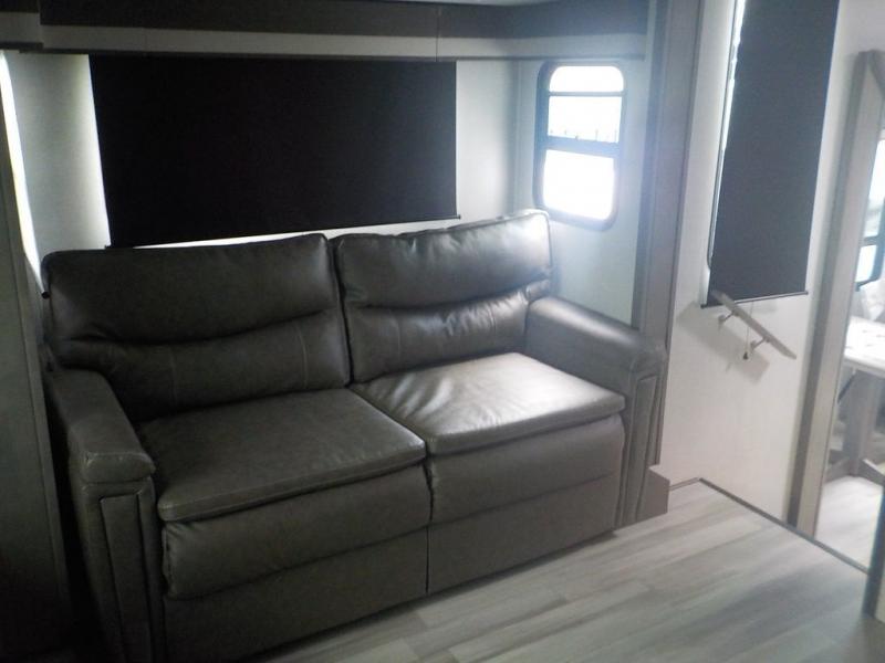 This Solitude S-Class unit is the perfect choice for a couple that enjoys traveling with guests thanks to the dual tri-fold sofas in the front living area that offer added sleeping space for four more campers! This will be a great space to all gather for movies or just hanging out with theater seating and a fireplace beneath the telescoping TV. Step down from the front living area to a spacious kitchen with dual slides. You will find ample counter space with the added island, plus two flip-up countertop areas. A free standing dinette is perfect for meals or game time as well. Head toward the rear of the unit for a quite retreat to the master bedroom with queen bed slide. A king-sized bed option can be chosen if you prefer a bit more room in bed. A dual entry bath features a sunken shower with skylight, plus vanity with sink and medicine cabinet for your toothbrushes and more. The bedroom also provides a dresser with TV prep above, and closet space along the rear wall with drawers beneath for more storage. One portion of the closet has been prepped for a washer/dryer if you choose to add that convenience.