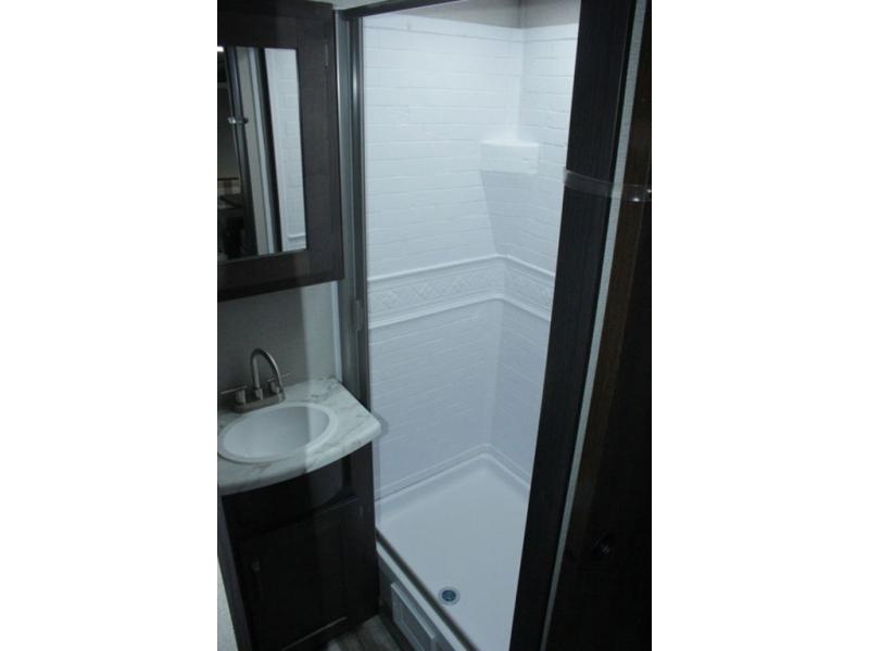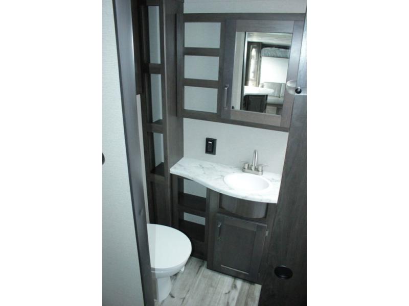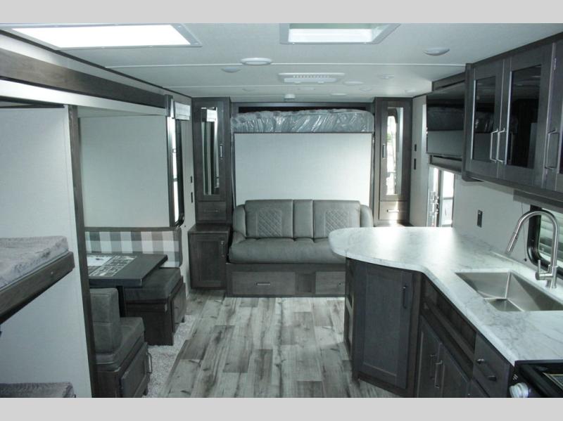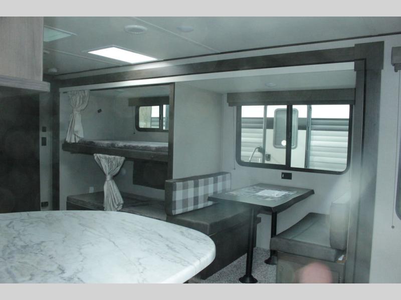 Camping trips in this travel trailer are fun for everyone. You will love the versatile queen Murphy bed up front that can fold away each morning; now you can relax on the sofa! There are bunk beds with drawers and a booth dinette within the large slide out, or you can choose the optional tri-fold sofa and theater seats if you don't need the bunks. Everyone will stay entertained with having a 32" LED TV on board, or you can enjoy fresh air outdoors under the 19' power awning. There is even an outside kitchen here! And when you're ready to call it a night, you can clean up in the full rear bath that includes plenty of storage for all your necessities.