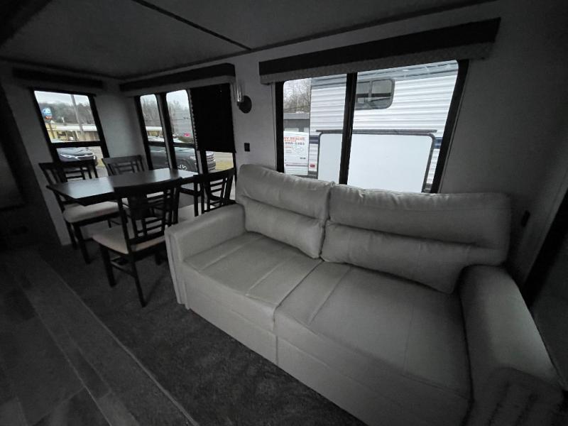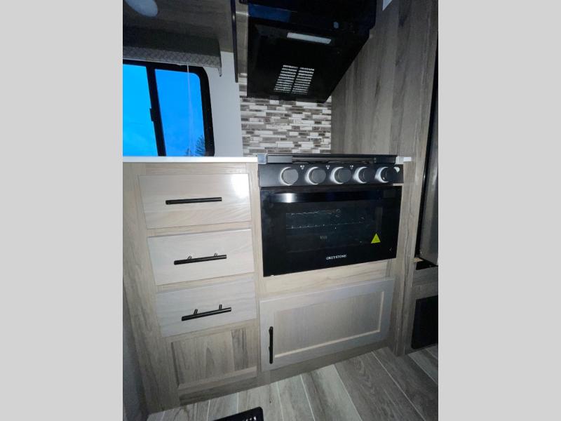 The chef will love cooking in the rear kitchen of this travel trailer! It not only has a 10.7 cu. ft. Everchill refrigerator to keep your perishables fresh, but also a three burner gas range with super burner and oven. You can enjoy your meals at the booth dinette or switch it out for the optional table and chairs. The tri-fold sofa offers a comfortable place to take an afternoon nap and the chairs are the perfect place to watch your favorite movies with the entertainment center or you can switch the chairs out for the optional theater seating instead. Across from the full bathroom with a neo-angled shower is a wardrobe to use as needed. Rest easy each night in the front private bedroom on the RV queen bed with a shirt closet on one side and a wardrobe on the other side to keep your clothes looking their best!