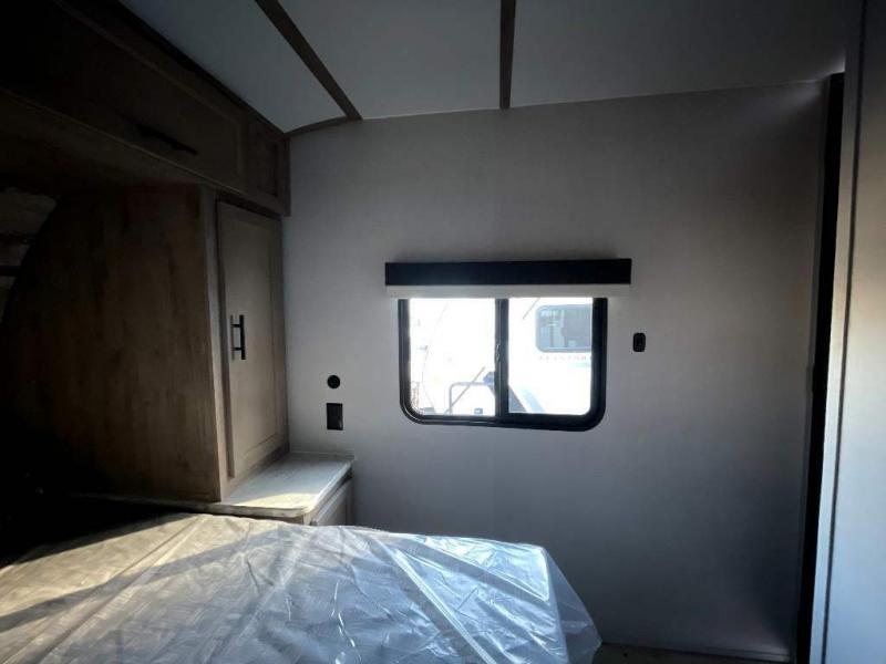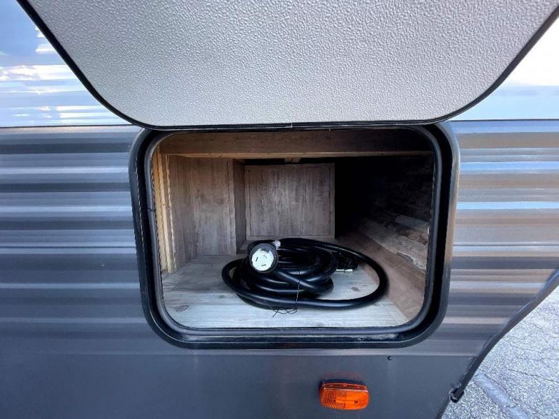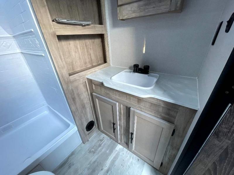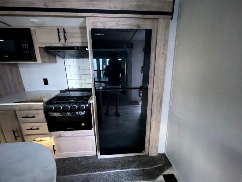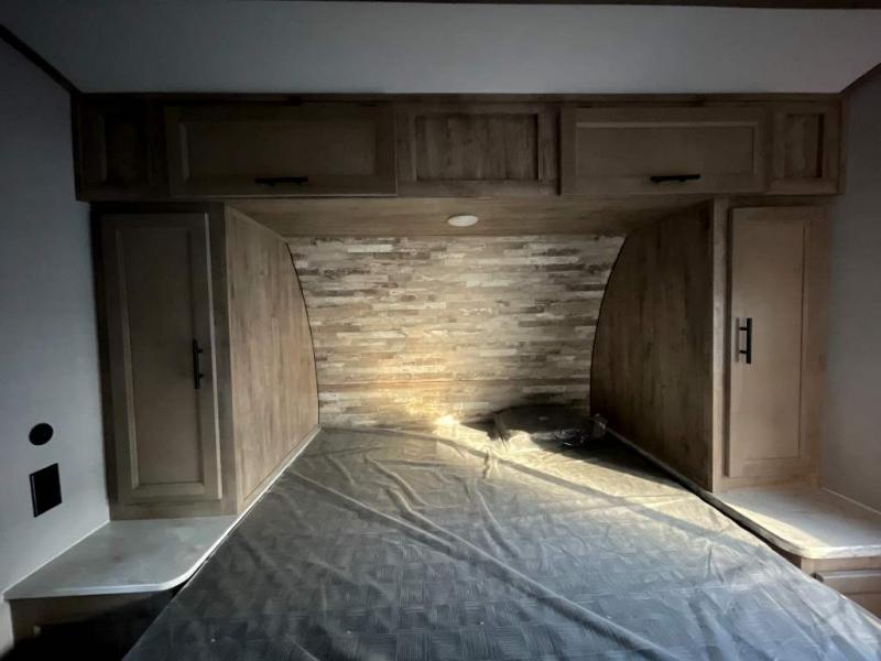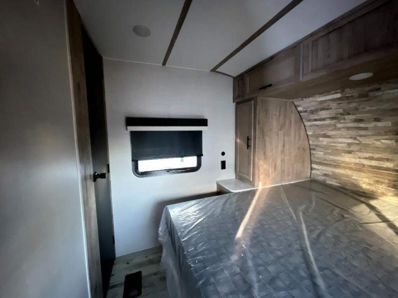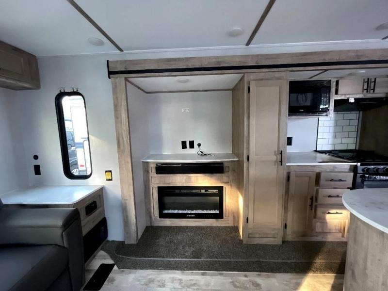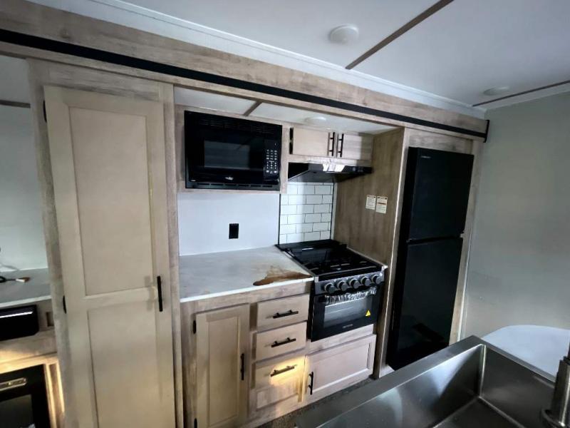 This travel trailer is perfect for two people looking to camp in comfort! The front private bedroom has a queen bed to lay your head at night and a wardrobe to keep your clothes looking their best. Freshen up each morning in the full bathroom then head to the kitchen and fry up some eggs on the three burner gas range with super burner and eat them at the booth dinette which can be switched out for an optional table and chairs. The kitchen island will make your meal prepping easier too. When you're ready to wind down your nights, relax in the rear living area on either the jackknife sofa or one of the two chairs which can be replaced for optional theater seating across from the entertainment center with overhead cabinets to store your movies!