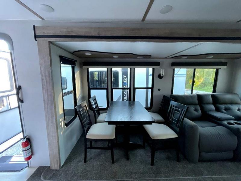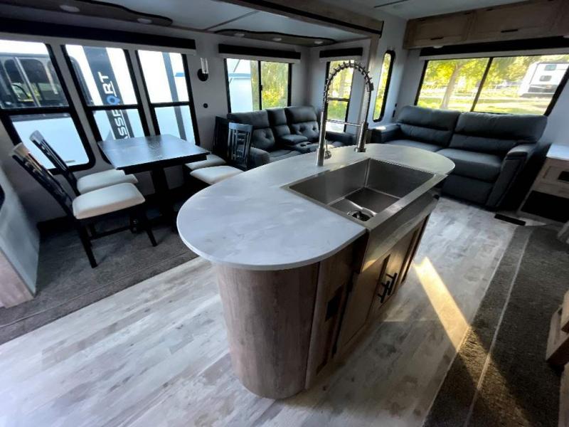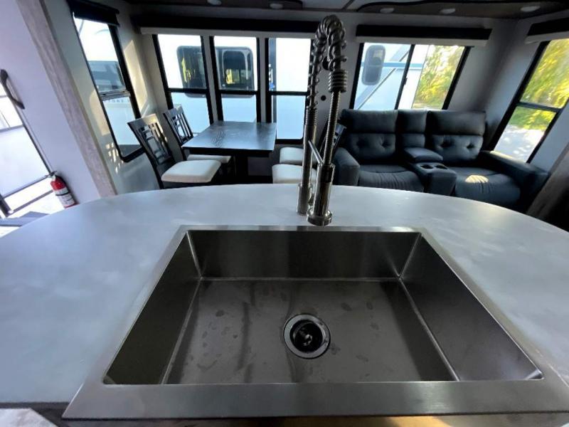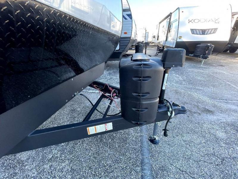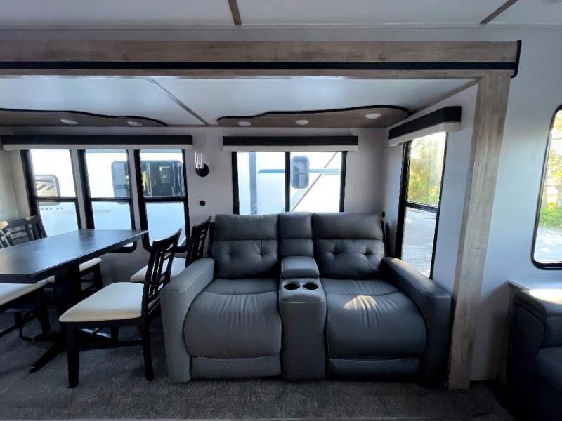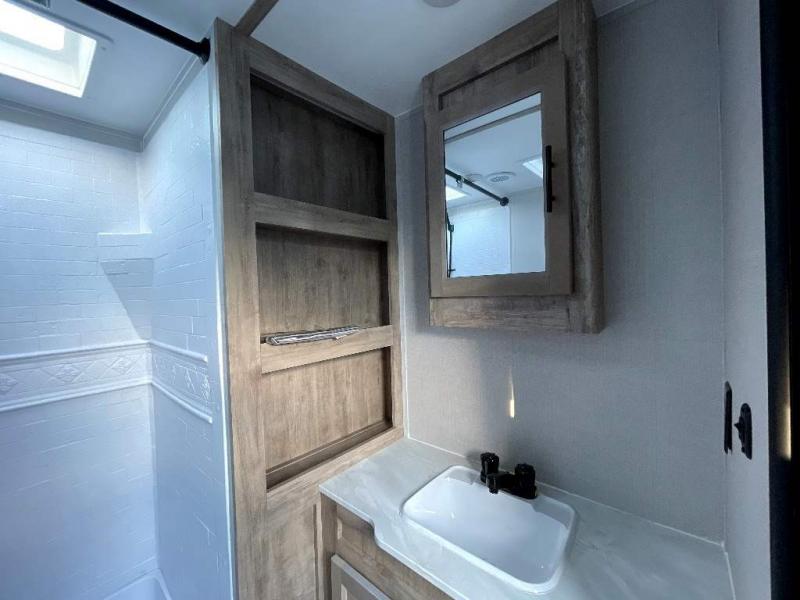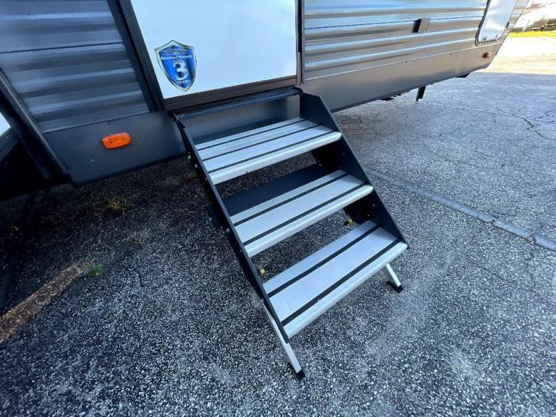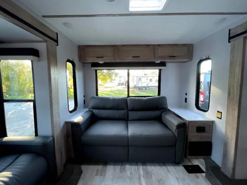 This travel trailer is perfect for two people looking to camp in comfort! The front private bedroom has a queen bed to lay your head at night and a wardrobe to keep your clothes looking their best. Freshen up each morning in the full bathroom then head to the kitchen and fry up some eggs on the three burner gas range with super burner and eat them at the booth dinette which can be switched out for an optional table and chairs. The kitchen island will make your meal prepping easier too. When you're ready to wind down your nights, relax in the rear living area on either the jackknife sofa or one of the two chairs which can be replaced for optional theater seating across from the entertainment center with overhead cabinets to store your movies!