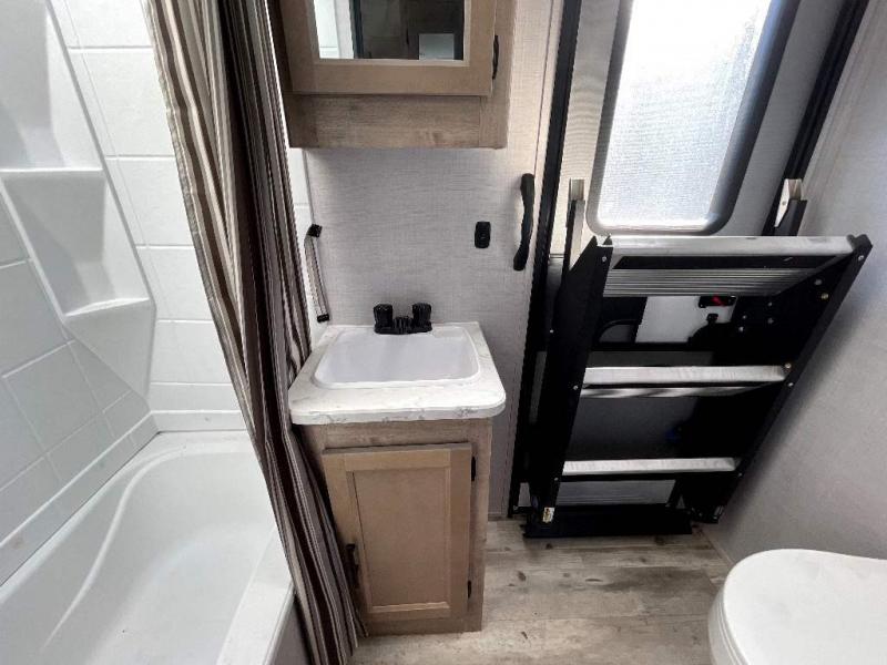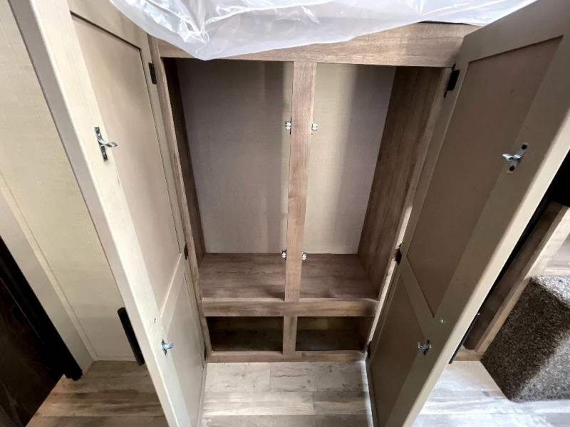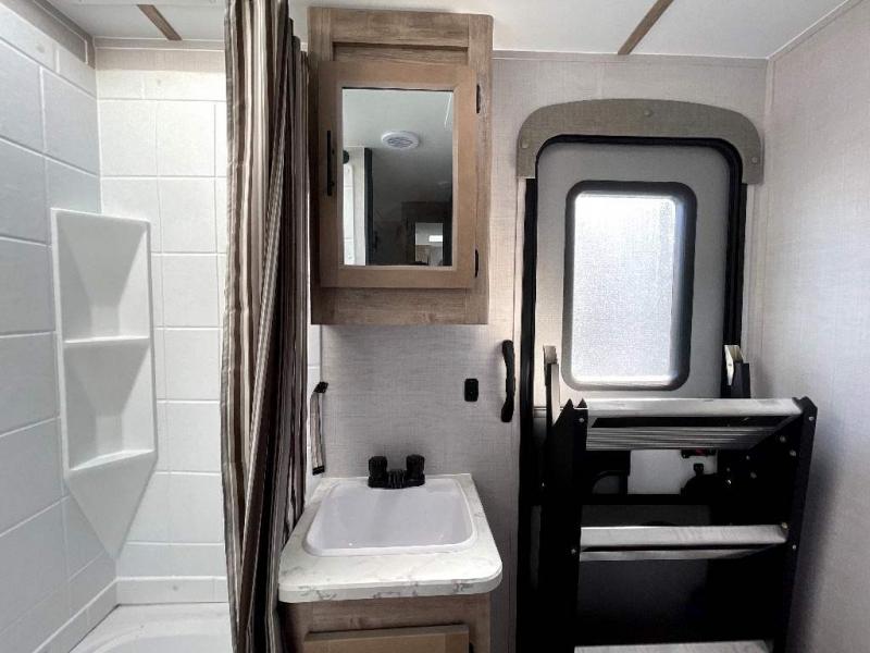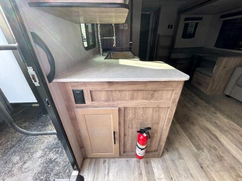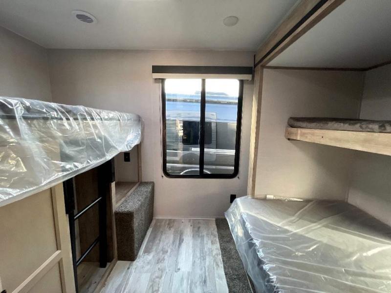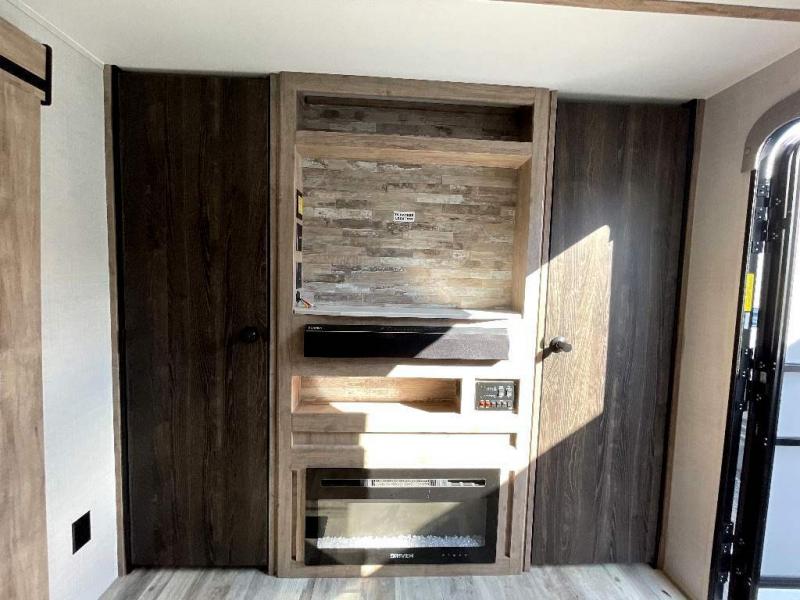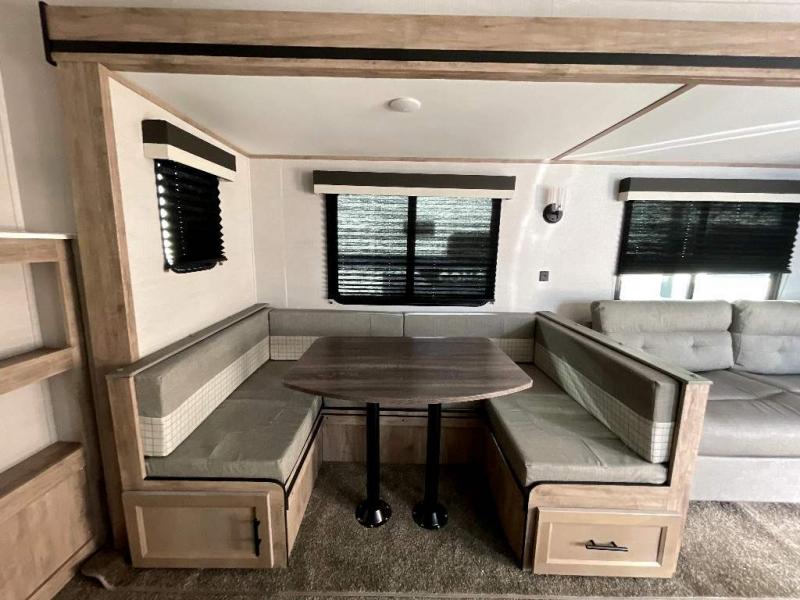 The whole family will have a comfortable place to sleep in this travel trailer! The kiddos can sleep in the rear private bunkhouse with the set of bunk beds slide and the bunk above the wardrobe and entertainment center. You will have your own privacy with the front private bedroom that has a RV queen bed, a shirt closet and a wardrobe on either side, and doors on either side of the living area entertainment center to enter/exit the bedroom. Take an afternoon nap on the sofa or play a card game at the U-shaped dinette after enjoying a delicious meal prepared with the three burner gas range with super burner and oven. There's even an outside kitchen that you can prepare your meals at too!