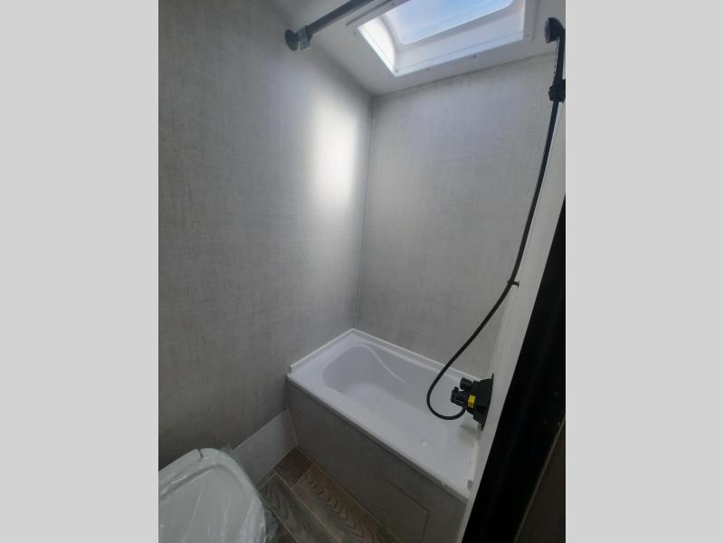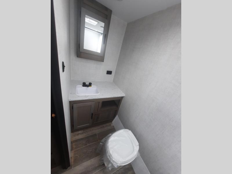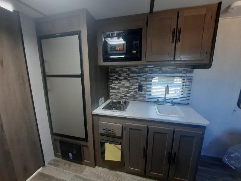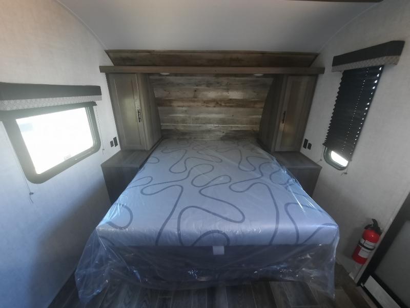 You and your spouse will be able to easily tow and set up for a weekend of outdoor fun with this trailer! The rear full bathroom offers privacy and convenience especially at night, and the two-burner cooktop allows you to make warm meals. You will find storage in overhead cabinets as well as in the dual closets and on the nightstands up front. And the walk-around queen bed will allow you to rest up for more adventure the next day.