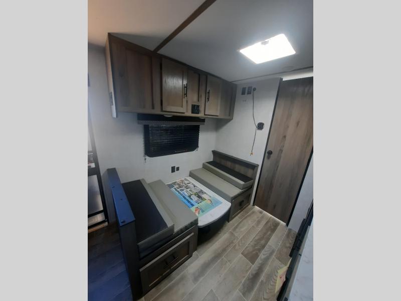 Are you looking for something to travel in with your significant other? Look no further, this is the perfect couple's trailer with extra sleeping space on the booth dinette for overnight guests. With a large queen bed, Full kitchen, and rear bathroom, you can head out on a weekend getaway.