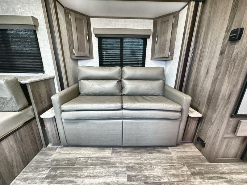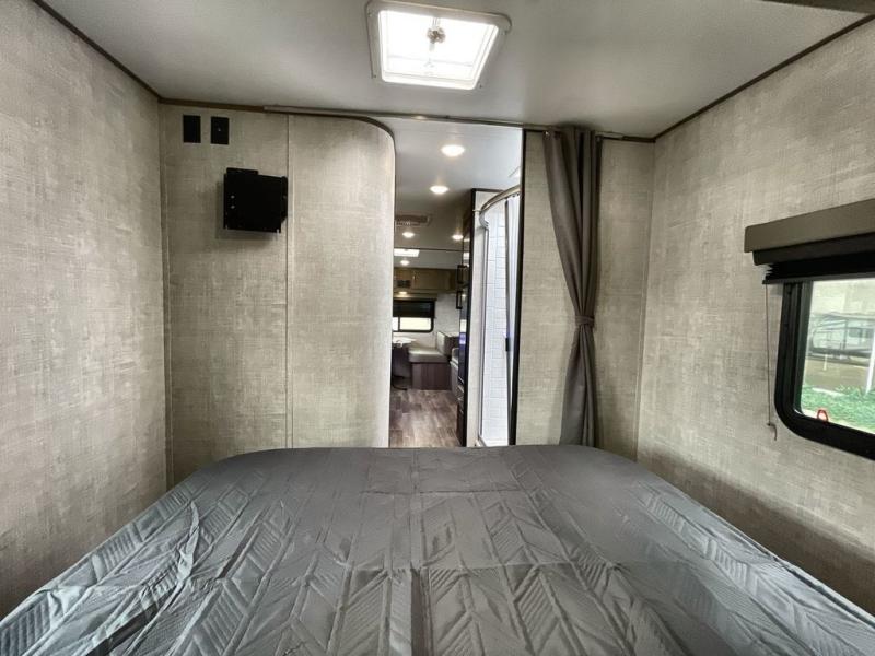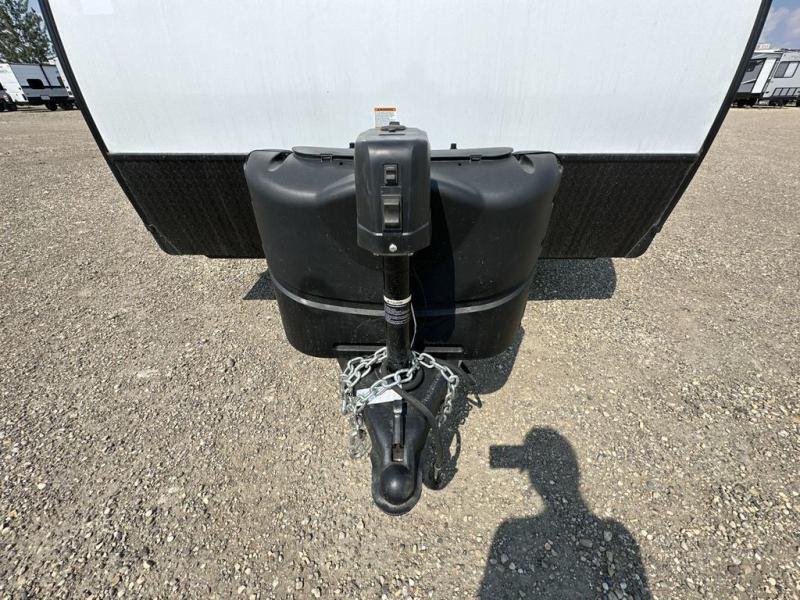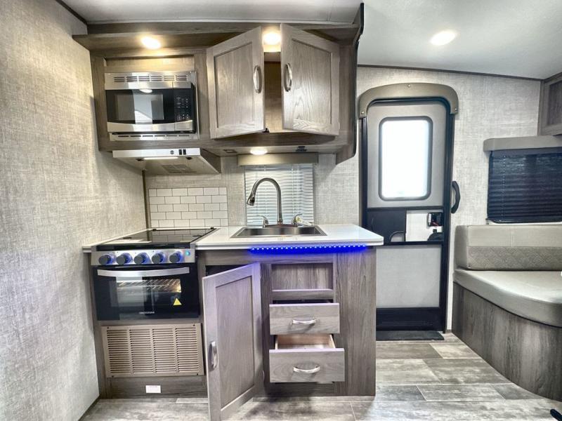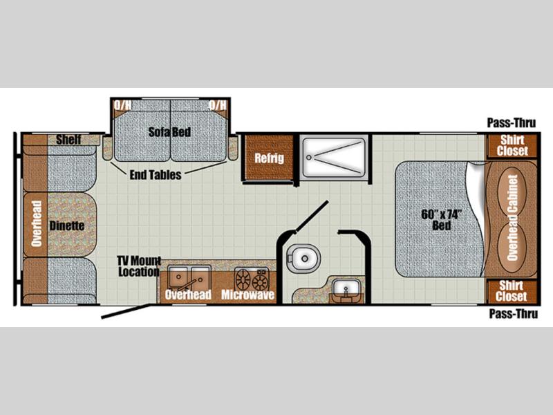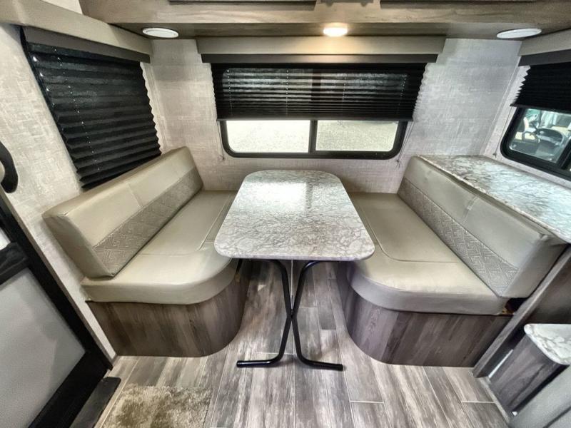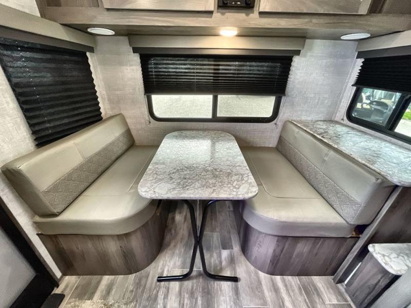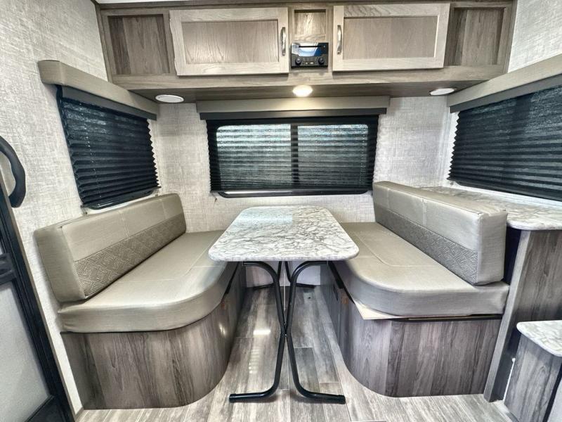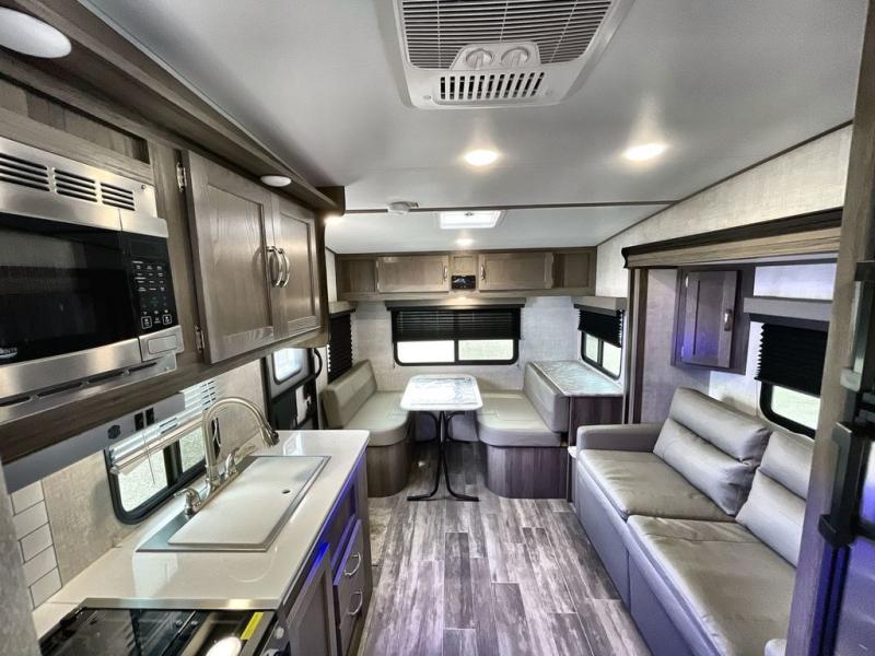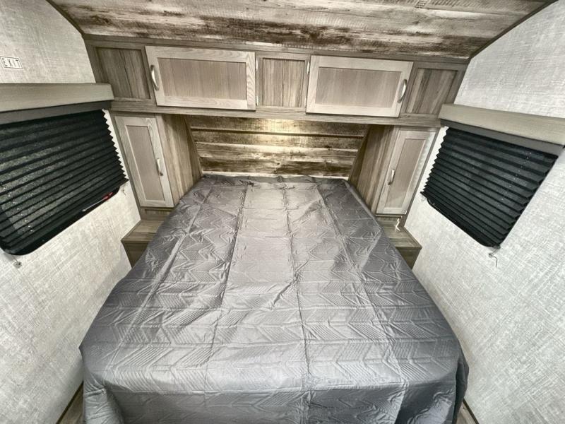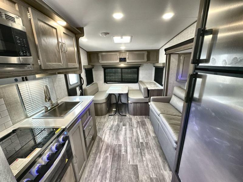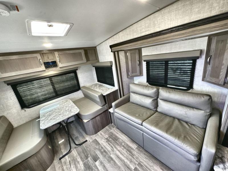 Book your favorite campsite and head to a great weekend getaway with your spouse and a guest or two in this travel trailer! There is a front 60" x 74" bed with shirt closets on either side for you to sleep on, and your guests can sleep on the sofa bed slide with end tables, as well as the rear booth dinette once they are converted. Whip up your best meals for everyone in the fully equipped kitchen that even has a microwave to pop a bag of popcorn at night. With a separated bathroom, everyone will be able to start their mornings feeling squeaky clean!