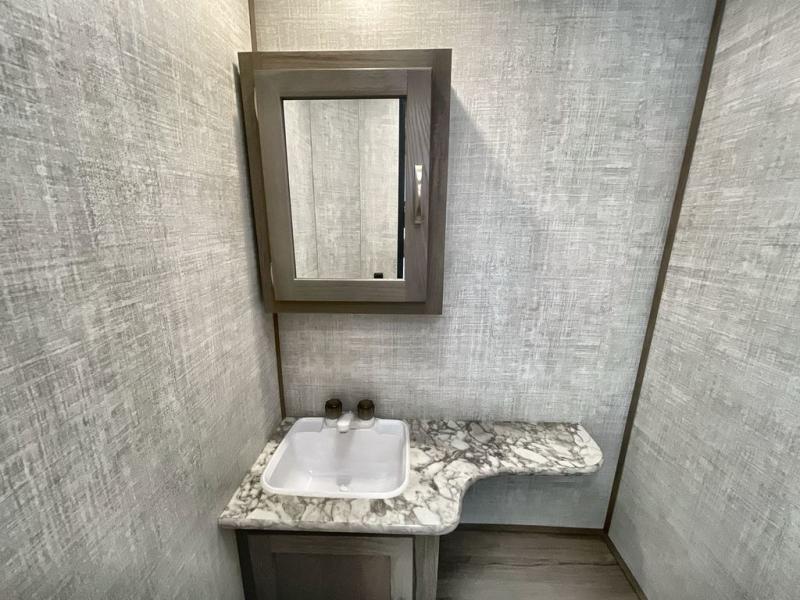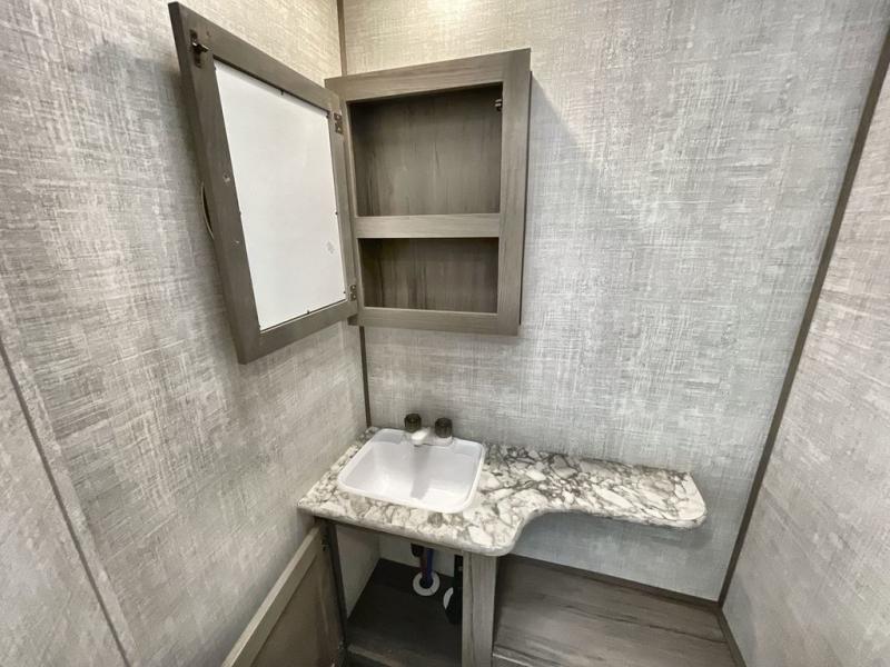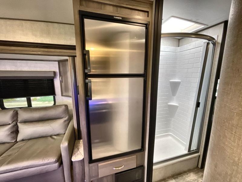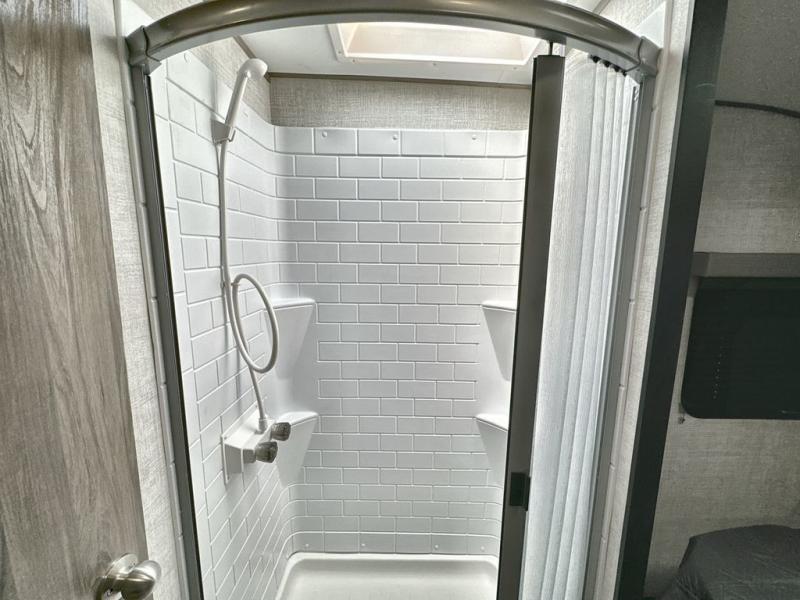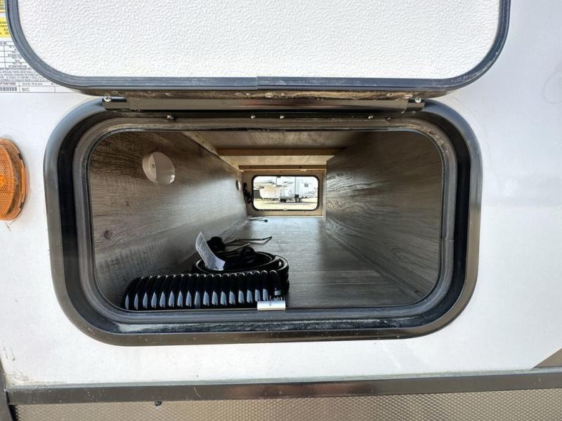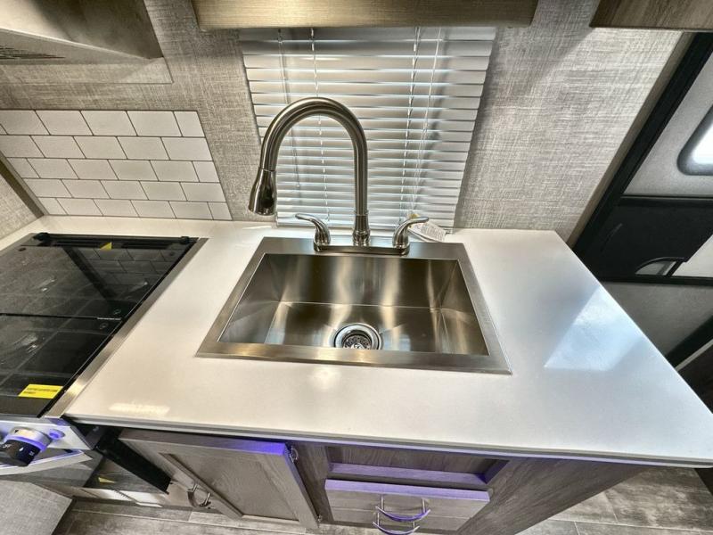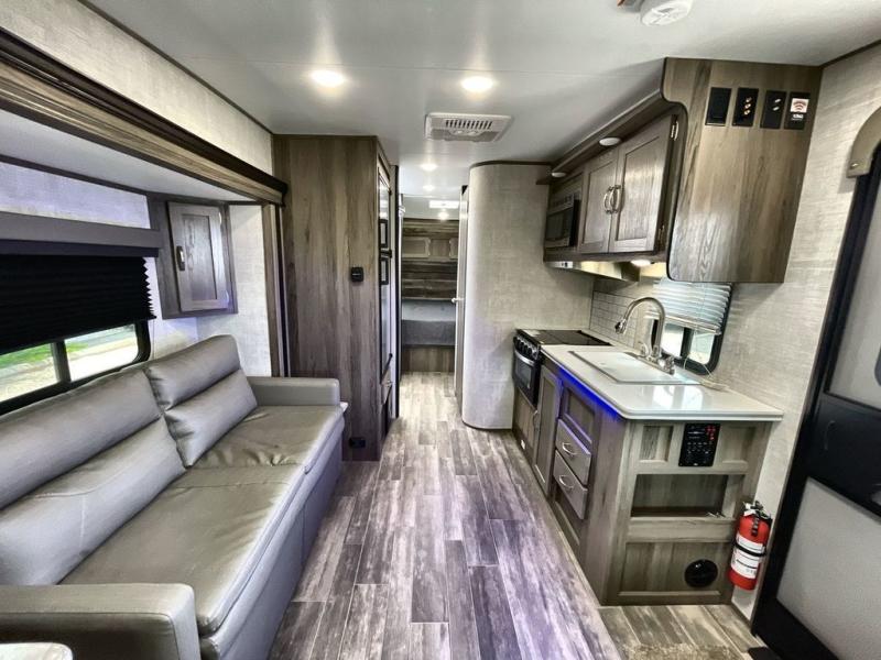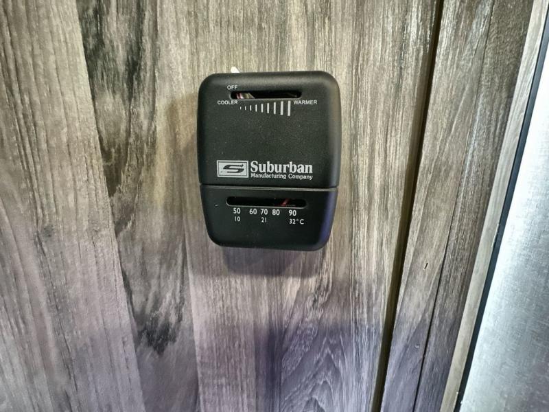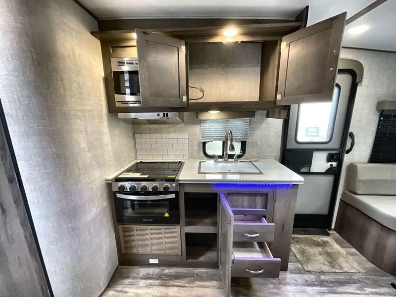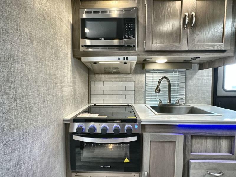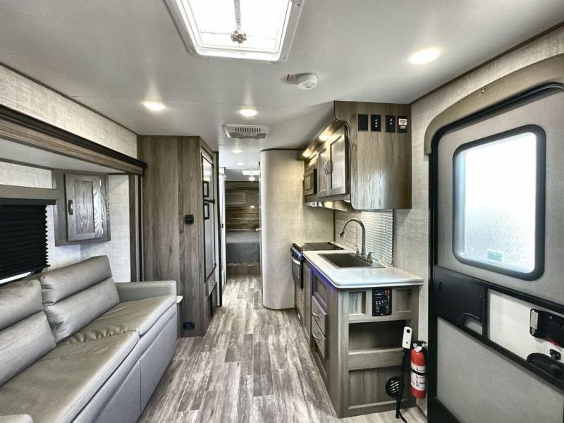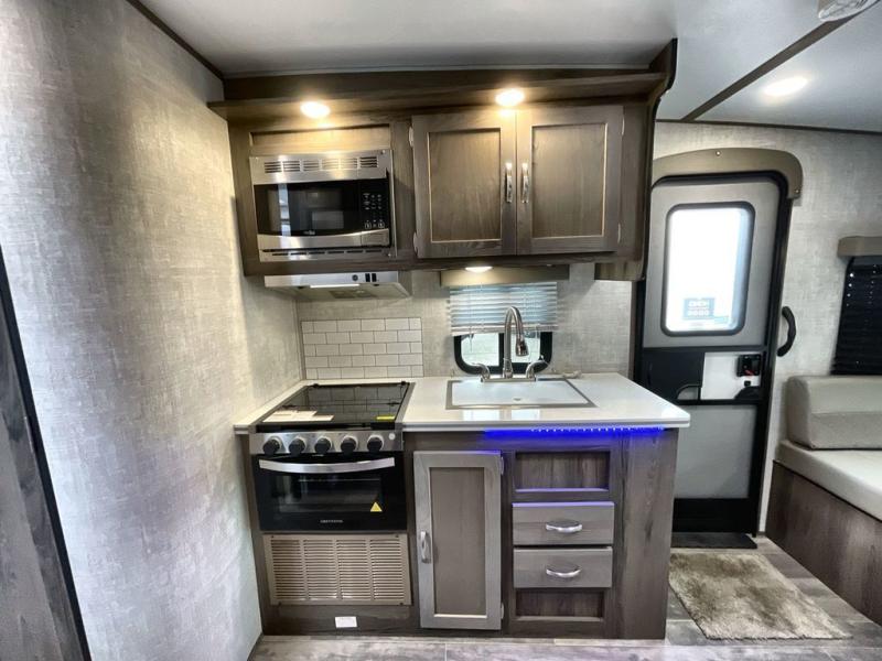 Book your favorite campsite and head to a great weekend getaway with your spouse and a guest or two in this travel trailer! There is a front 60" x 74" bed with shirt closets on either side for you to sleep on, and your guests can sleep on the sofa bed slide with end tables, as well as the rear booth dinette once they are converted. Whip up your best meals for everyone in the fully equipped kitchen that even has a microwave to pop a bag of popcorn at night. With a separated bathroom, everyone will be able to start their mornings feeling squeaky clean!
