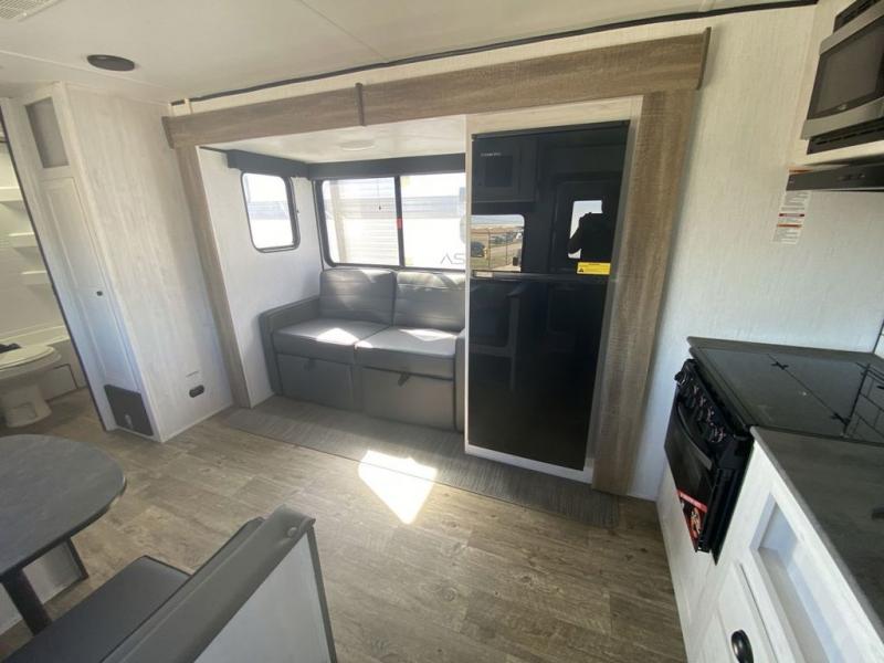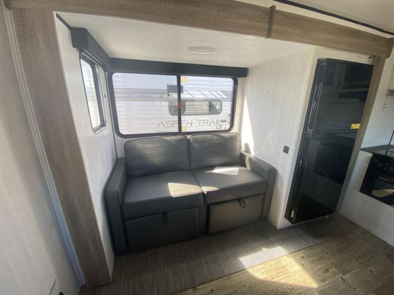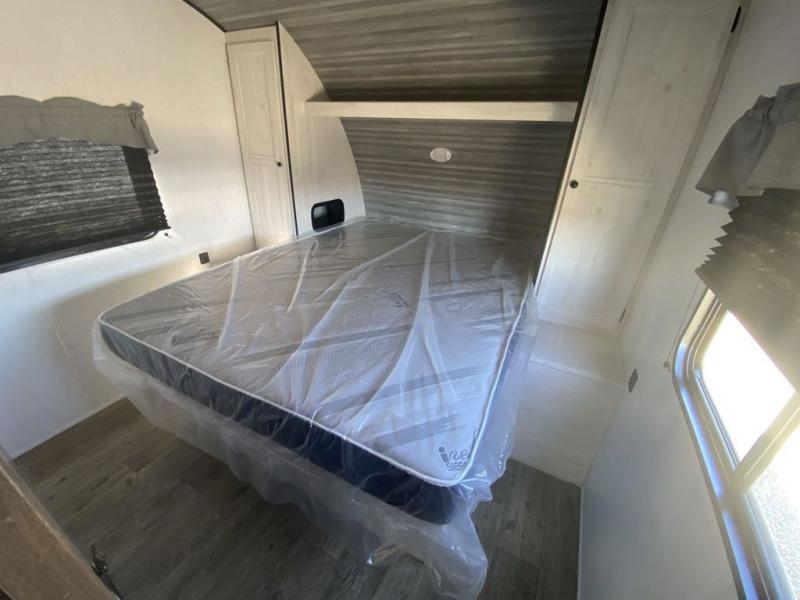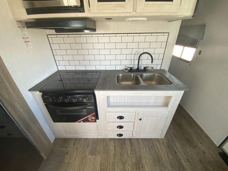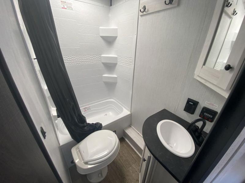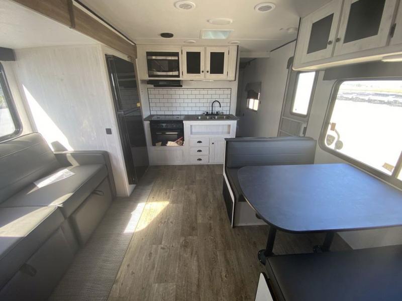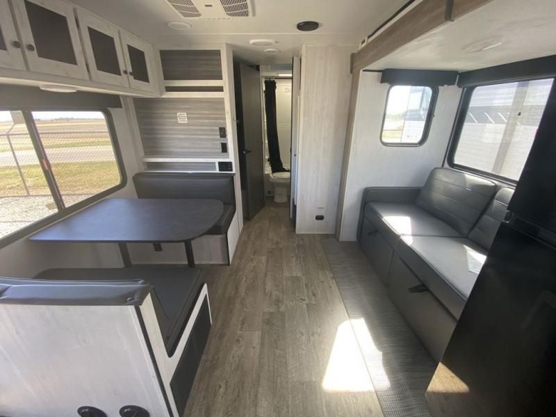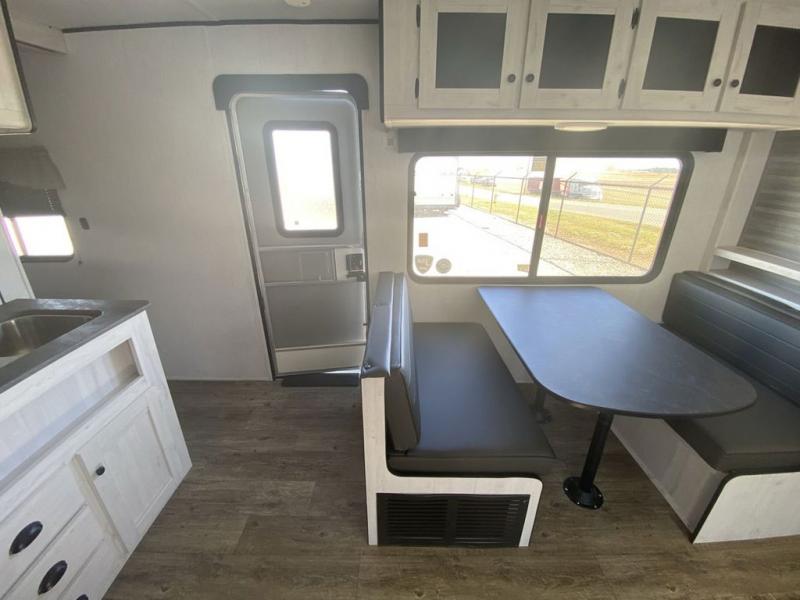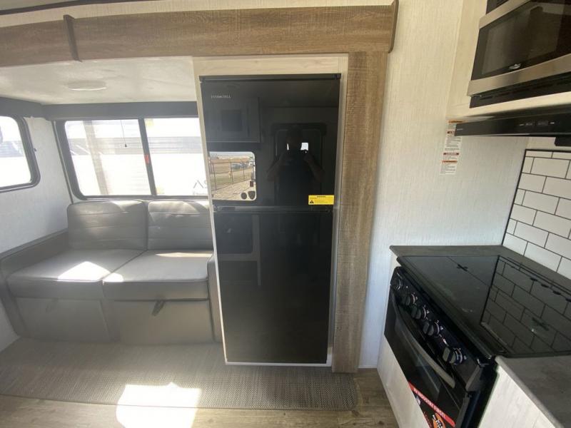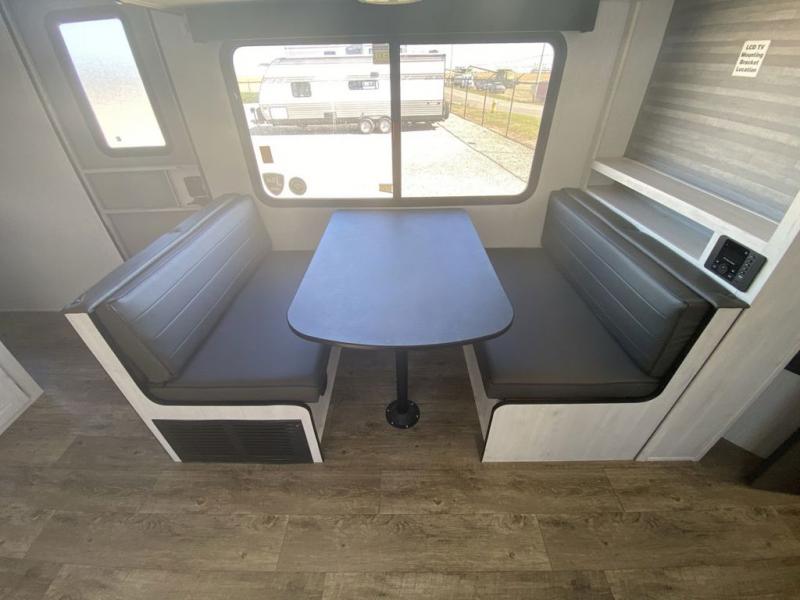 Enjoy family time at the campground with this travel trailer! The kiddos can sleep on the set of double bunk beds and you will have your own privacy with the front private bedroom which has a queen bed with under-bed storage and wireless cell charging stations for one less thing to bring with you. The chef can whip up their best meals with the three burner cooktop and everyone can enjoy them together at the booth dinette then play a card game or two. If you're not big into card games then you can relax on the sofa while you enjoy a cold drink stored in the 10 cu. ft. stainless steel refrigerator. Freshen up each day in the rear corner bathroom with the ABS tub/shower surround with a skylight above it!